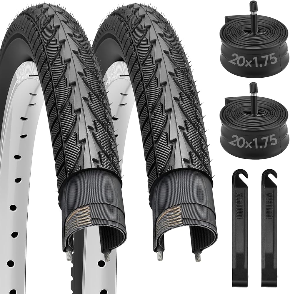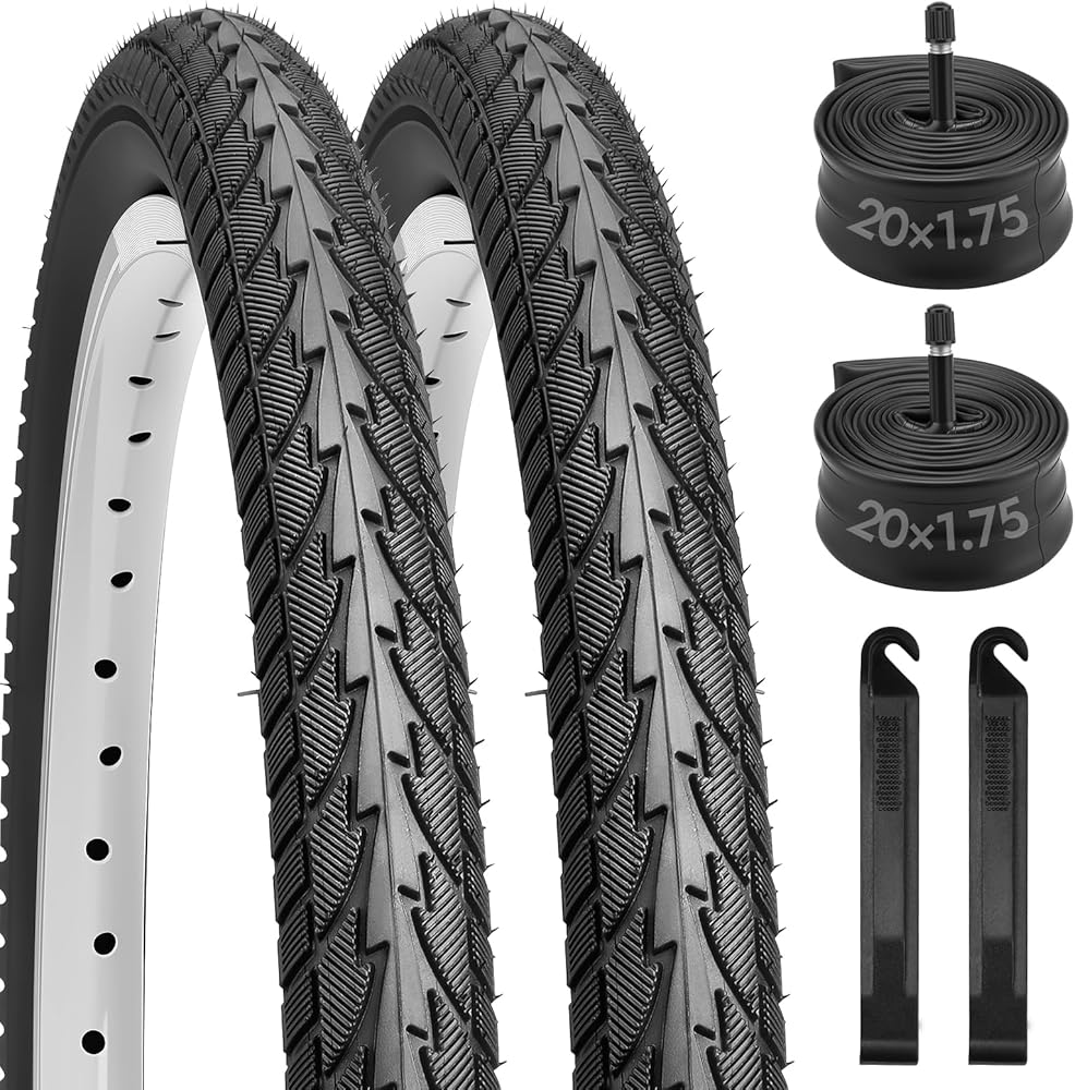 مجموعة إطارات دراجة مقاس 20 × 1.75، إطارات دراجة قابلة للطي مقاس 20 بوصة بديلة لإطارات وأنابيب الدراجات المقاومة للاهتراء تتضمن زوجًا من رافعات الإطارات لدراجات MTB على الطرق الوعرة الهجينة في المدينة