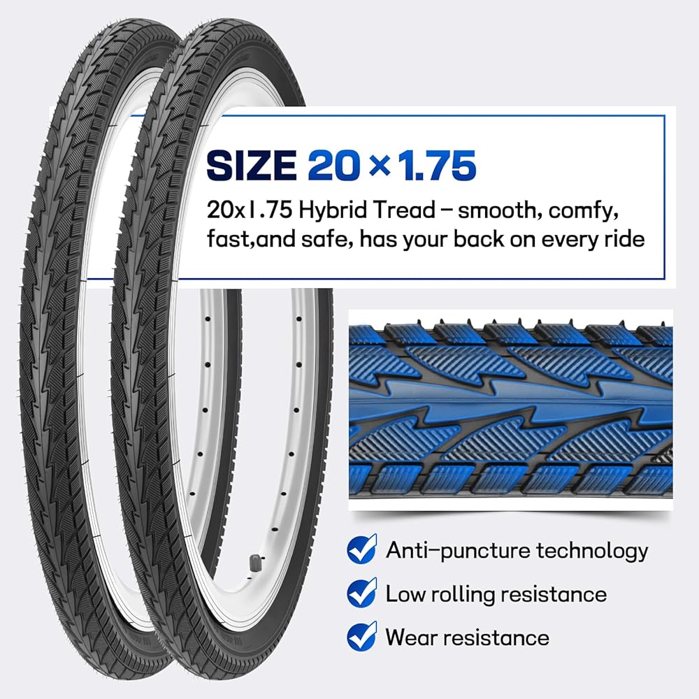 【هيكل متين للغاية】: إطارات الدراجة مقاس 20x1.75 مصنوعة من مطاط عالي الجودة ومعززة بتقنية سلك النايلون - مما يعزز بشكل كبير مقاومة التآكل ويطيل عمر خدمة الإطار. لا مزيد من القلق بشأن الثقوب المتكررة أو الحاجة إلى استبدال مبكر.