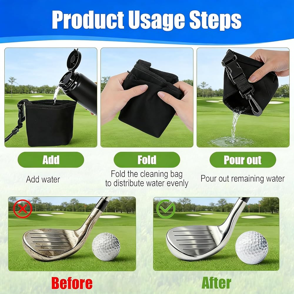 • 【3-Step Instant Clean】Golf club cleaning in 3 simple steps: Add 1/4 cup water, knead to distribute evenly (no water leakage), then wipe clubs/balls on the scrub cloth lining for spotless gear in seconds.