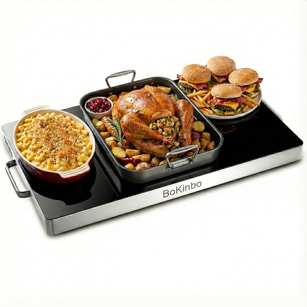 • 【التوافق العالمي والاتصال المباشر 】 الجزء العلوي المسطح من الفولاذ المقاوم للصدأ متعدد الاستخدامات وقوي. يتسع لجميع أواني الطبخ المقاومة للحرارة (القدور والمقالي وصواني الألومنيوم وأطباق السيراميك). على عكس الزجاج، فإن السطح الفولاذي المتين أكثر تسامحًا ويمكنه تحمل الأواني الثقيلة. إنها بمثابة محطة مثالية للحفاظ على الأطباق الرئيسية والجوانب والمقبلات دافئة أثناء عيد الشكر أو السبت أو الحفلات أو الوجبات العائلية اليومية.