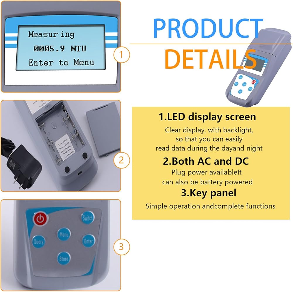 Introducing our advanced Turbidity Meter, a precision instrument designed to deliver accurate and reliable measurement results for a variety of applications, including water quality testing, environmental monitoring, and industrial processes. With its robust design and user-friendly interface, this turbidity meter is perfect for both professionals and enthusiasts who need dependable performance in their measurements. Featuring a 90° scattered light principle, our turbidity meter offers an impressive measurement range of 0-200 NTU and 0-1000 NTU, ensuring versatility for different testing scenarios. The device boasts a minimum detectable value of 0.1 NTU, with an error margin of only ±8% or ±6% for enhanced accuracy, making it suitable for critical applications where precision is paramount. The repeatability of ≤1% or ≤0.5% ensures consistent results every time, giving you peace of mind in your data collection. Designed for ease of use, the turbidity meter operates on five AA alkaline batteries (not included) or can be powered via AC220V, providing flexibility in various settings. To maintain optimal performance, it's essential to use the device in a stable environment, away from strong lighting and high-frequency electrical equipment. For best results, the instrument should be kept in a dry location with a controlled temperature of 5°C-35°C. This turbidity meter comes complete with everything you need to get started, including a storage box, three sample bottles, a tube, and a comprehensive manual. Please remember to keep the measuring cell clean and dry, and avoid using the device in humid conditions to ensure accurate readings. Whether you're conducting research, monitoring water quality, or performing routine inspections, our Turbidity Meter will be an invaluable tool in your toolkit. Experience the difference with our reliable, high-quality instrument designed for accurate turbidity measurements.