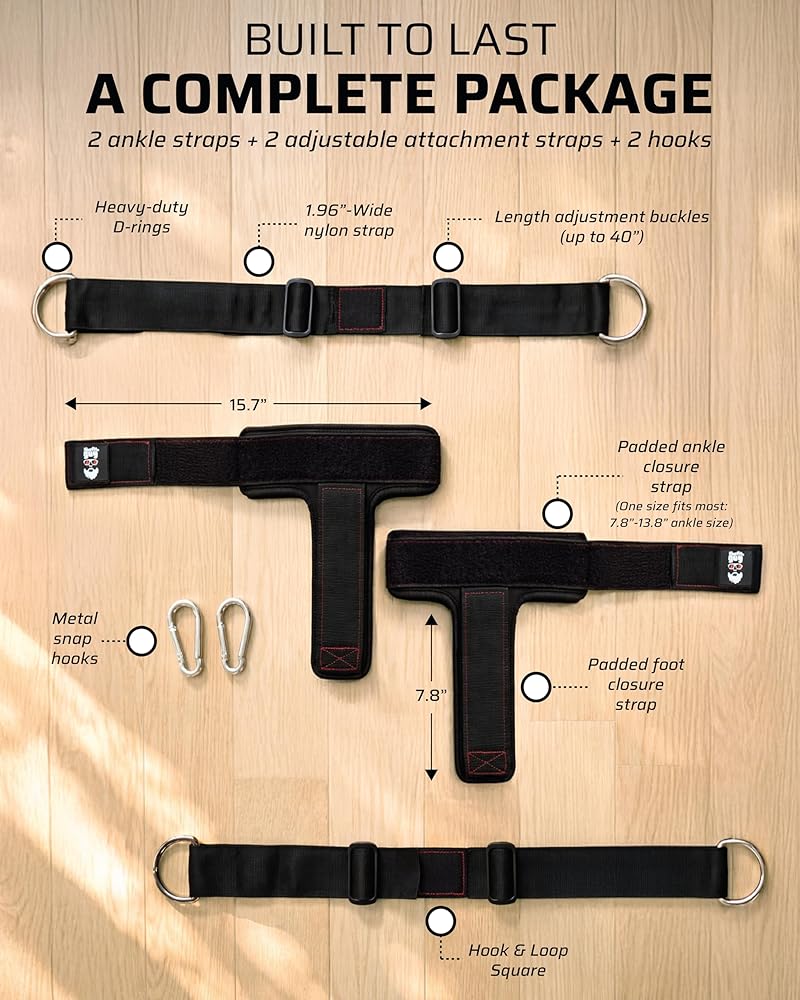 هيكل متين وجاهز للصالة الرياضية: أحزمة من النايلون عالي التحمل، وخياطة معززة، وحلقات معدنية قوية توفر الثبات والأداء طويل الأمد أثناء التدريب