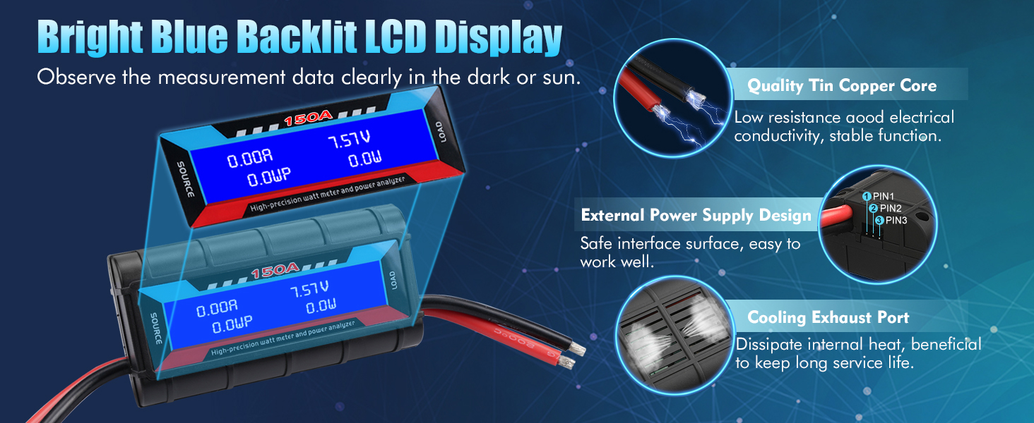 شاشة LCD بإضاءة خلفية زرقاء ساطعة، سهلة القراءة. سلك قياس 12 يأخذ فولت وتيار أعلى. لا غنى عنه لتحليل واختبار واستكشاف الأخطاء وإصلاحها لأي مشروع طاقة DIY DC. دقيق جدًا في إعطاء التيار المستمر فولت وأمبير وقوة كهربائية