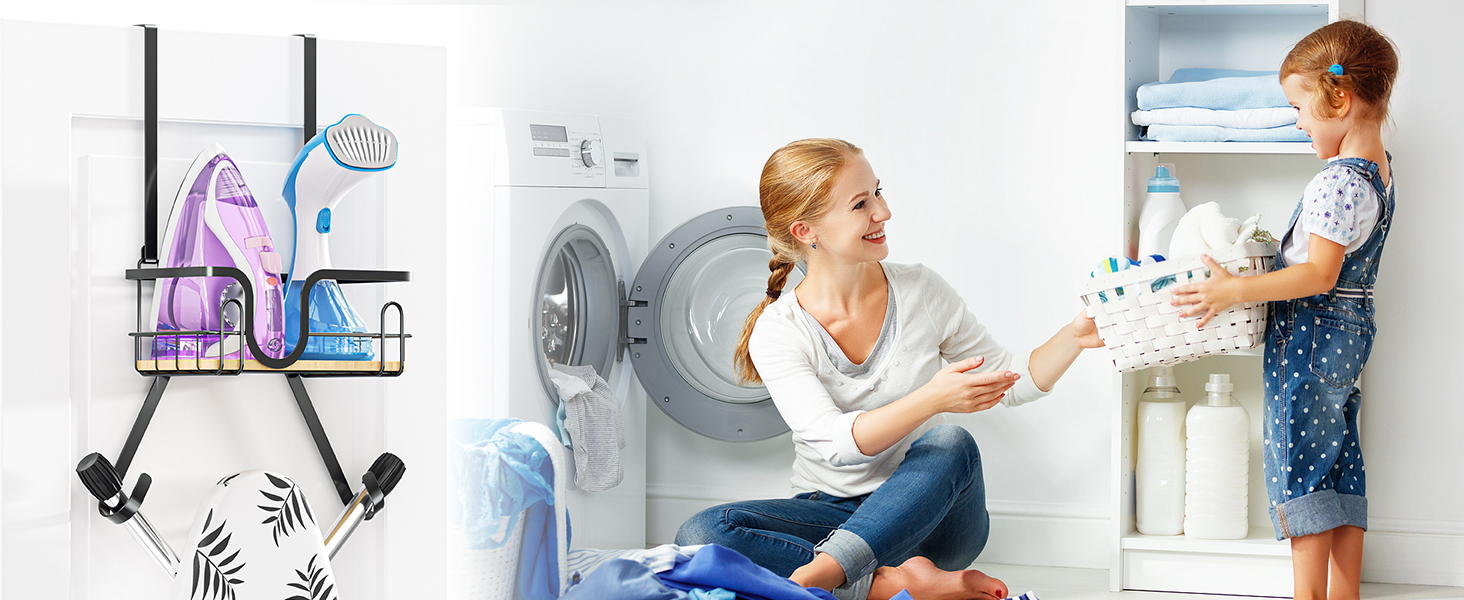 حامل طاولة الكي على الحائط، شماعة طاولة الكي، حامل ألواح الكي فوق الباب لتنظيم غرفة الغسيل، علبة المكواة وألواح الكي، شماعة مكاوي سوداء مع سلة تخزين (على شكل T&V)