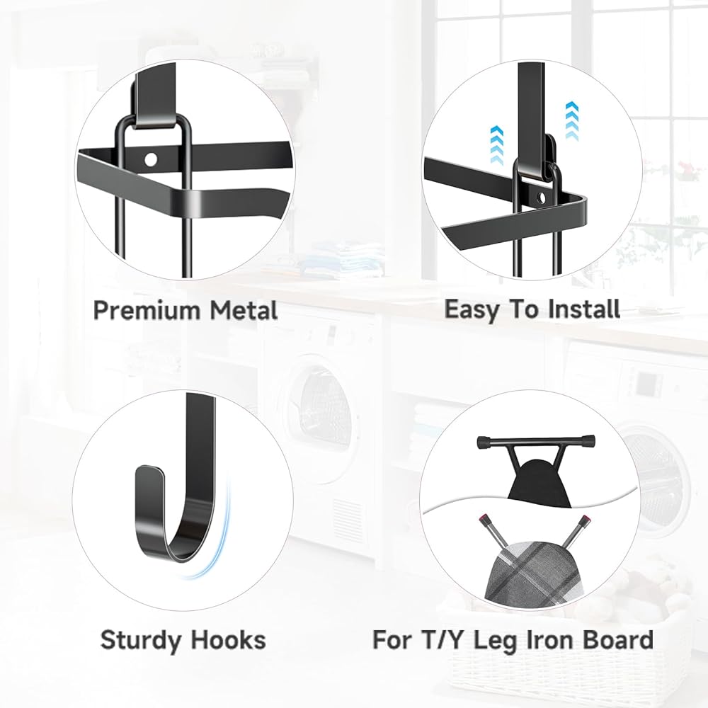 【خطافات قابلة للتعديل】: يتميز حامل لوح الكي الموجود فوق الباب بخطافات قابلة للتعديل (بحد أقصى 12.4 بوصة). وهي متوافقة مع معظم ألواح الكي على شكل حرف Y أو على شكل حرف T، مما يلبي احتياجاتك المتنوعة. تحافظ علاقة طاولة الكي على ترتيب أدوات الكي الخاصة بك وقل وداعًا لمتاعب البحث!
