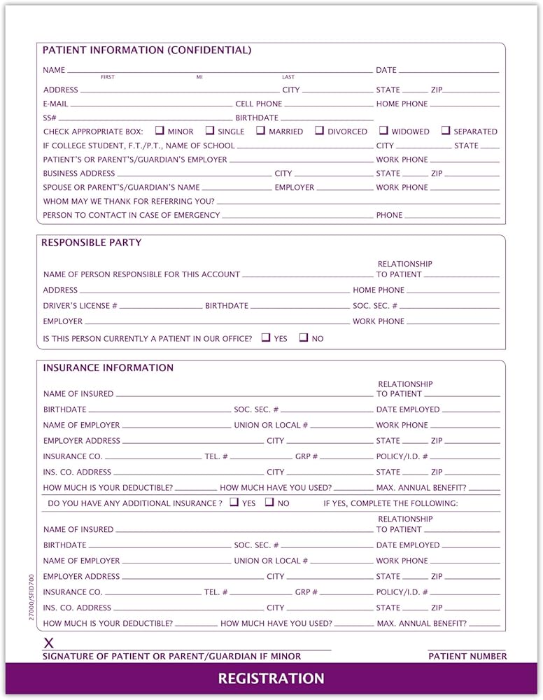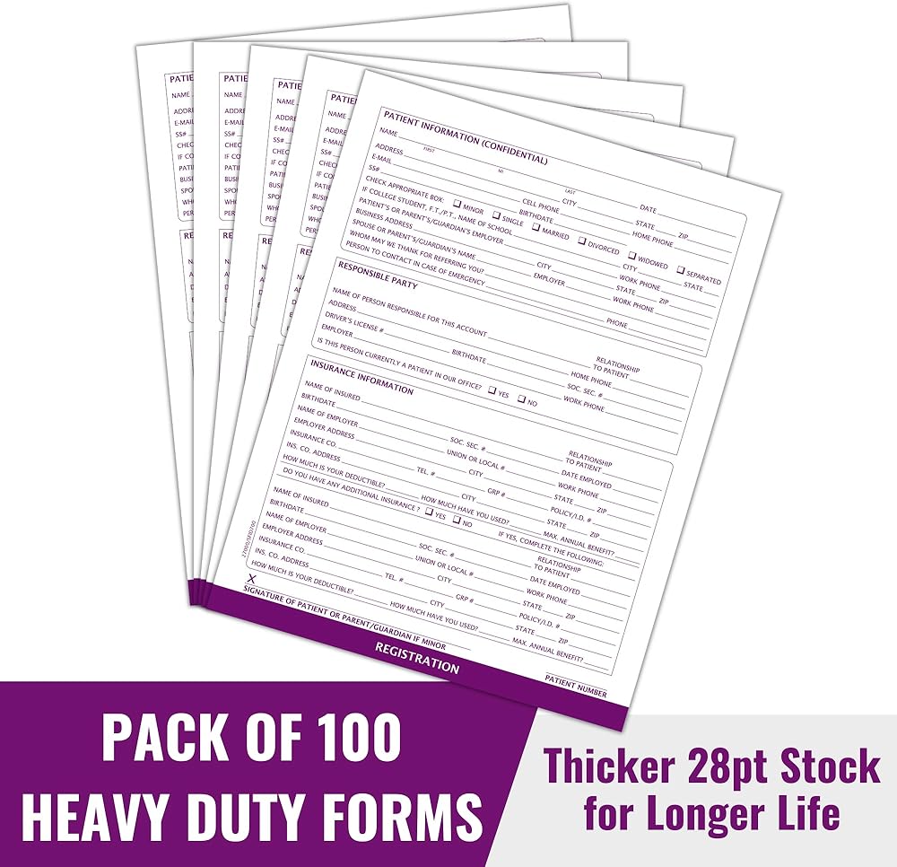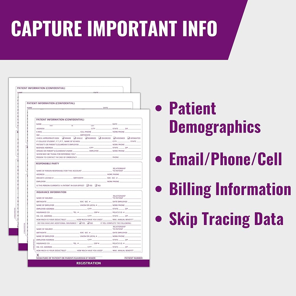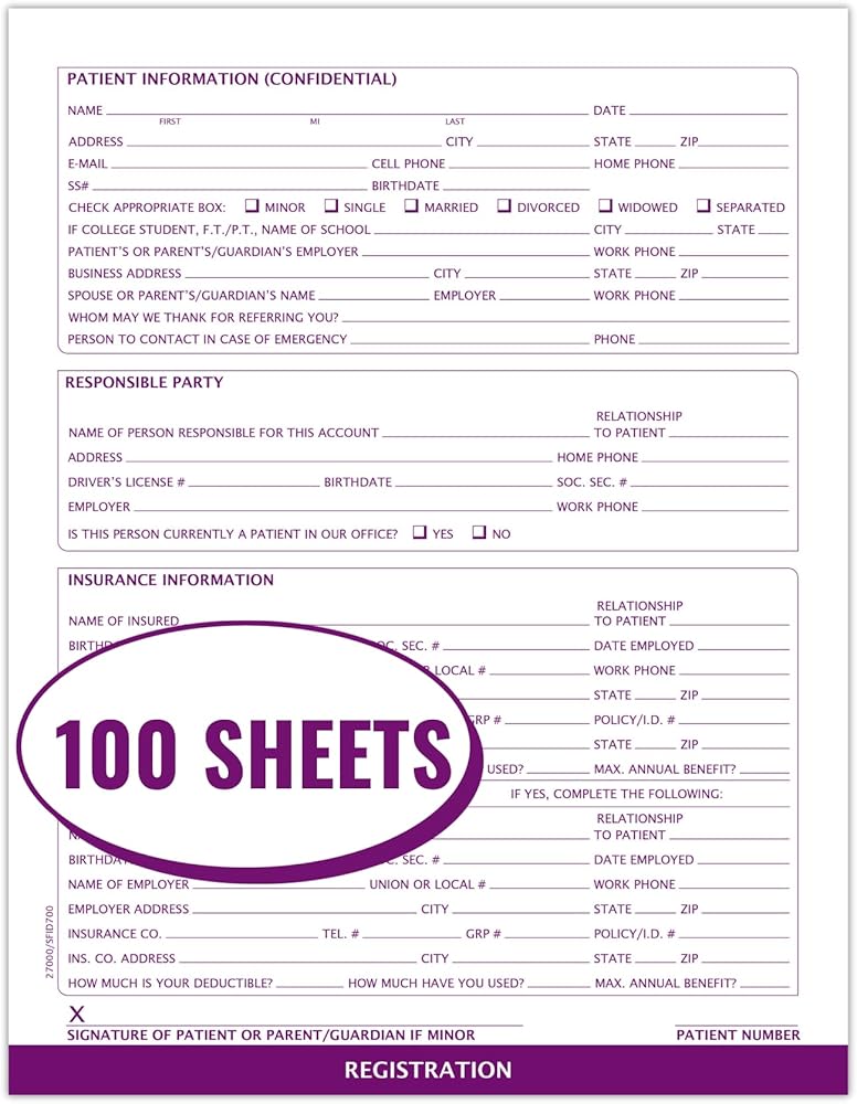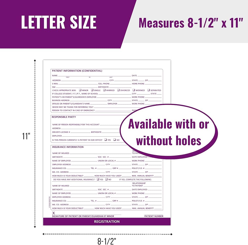 الوضوح وسهولة القراءة: تُطبع نماذج استقبال المرضى مقاس 8-1/2 × 11 بوصة على مخزون متين رقم 28 باللون الأرجواني، مما يوفر اللون والتباين المتميز. لا مزيد من التحديق أو فك رموز الكتابة اليدوية غير المقروءة. سيقدر المرضى هذه النماذج الاحترافية.