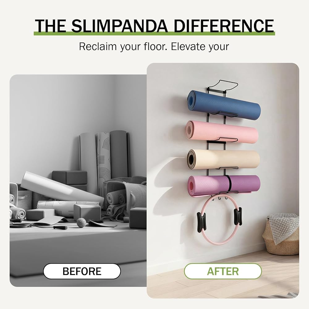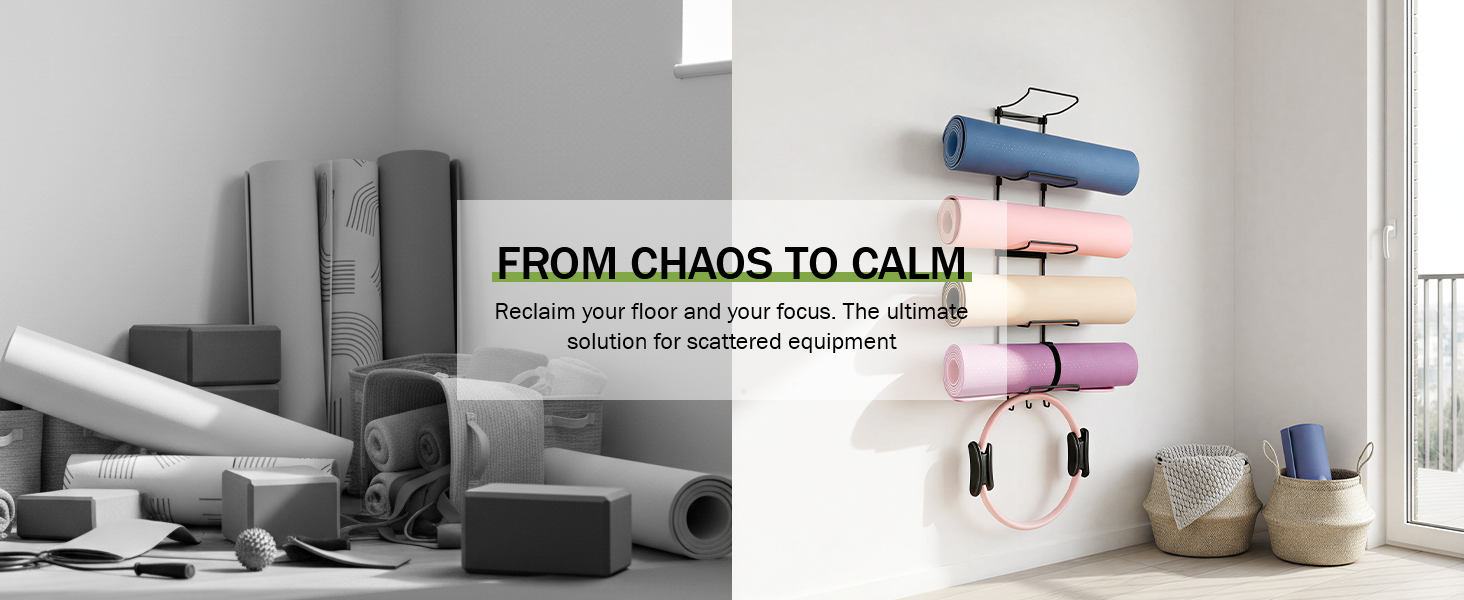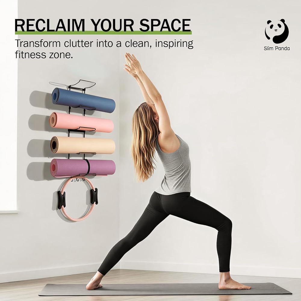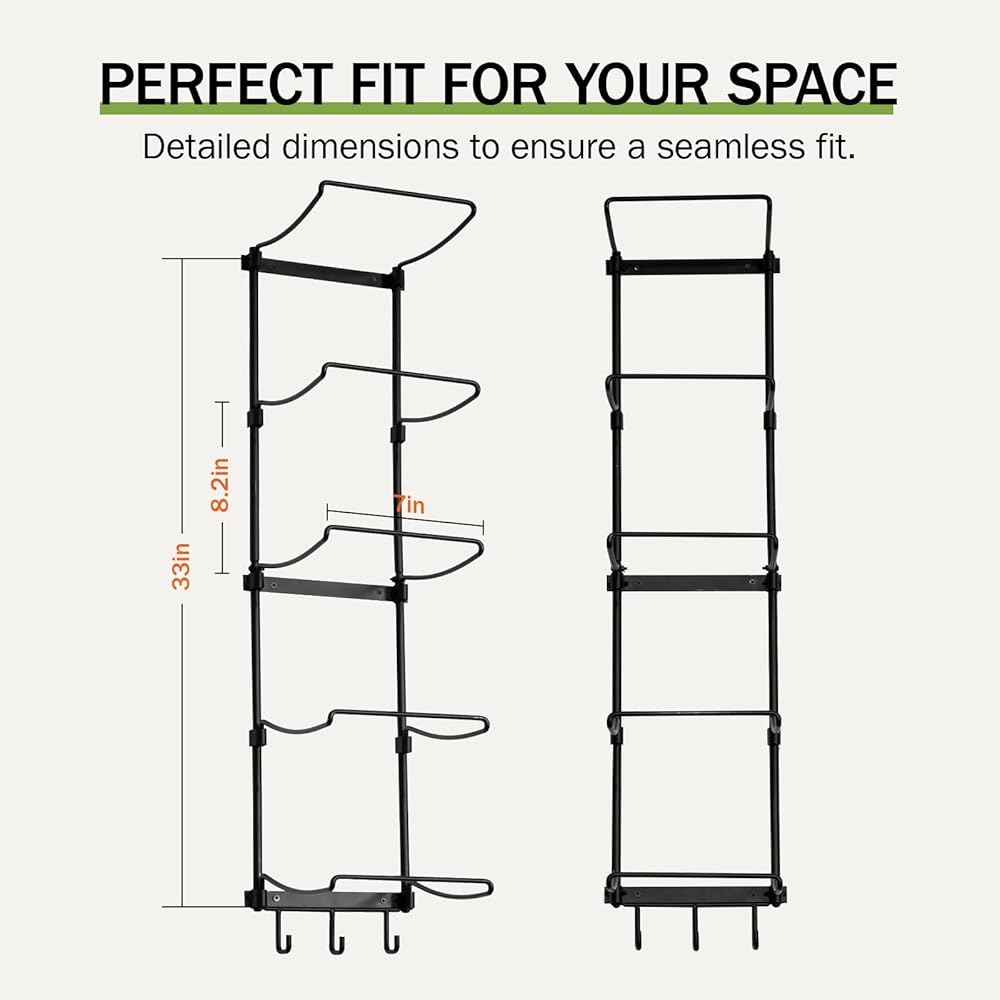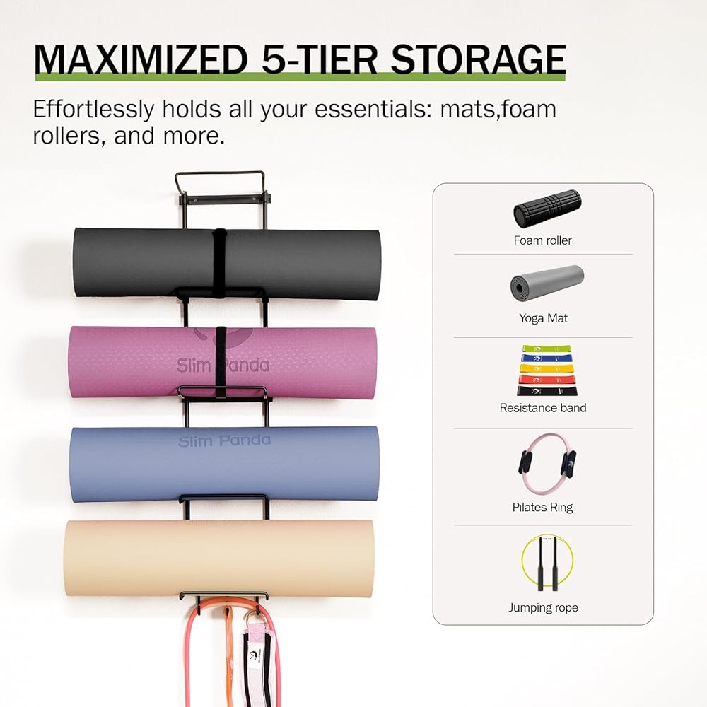 تعظيم المساحة والبقاء منظمًا: يوفر حامل سجادة اليوجا هذا مساحة أرضية ثمينة عن طريق التركيب على الحائط الخاص بك. يقوم تصميمه المكون من 5 طبقات بتخزين العديد من السجادات والعتاد عموديًا، مما يحول الفوضى إلى حل تخزين رياضي منزلي أنيق يبدو أنيقًا ومنظمًا.