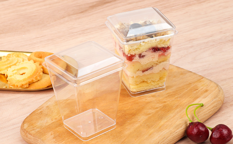 أكواب الحلوى البلاستيكية ذات الأغطية مصنوعة من بلاستيك عالي التحمل وقابل لإعادة التدوير، هذه الأكواب ليست سهلة الخدش أو الكسر أو التشوه، صالحة للطعام، خالية من البيسفينول أ، قابلة لإعادة الاستخدام أو للاستعمال مرة واحدة.