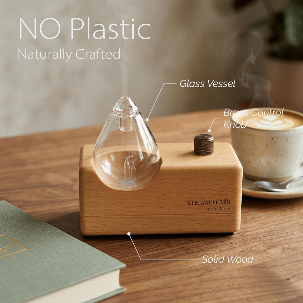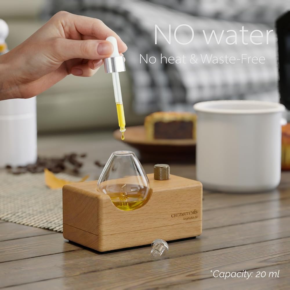 موزع روائح الزيوت العطرية الزجاجي ذو قطرة الماء مع قاعدة خشبية مصنوعة يدويًا للعلاج بالروائح، موزع روائح بدون ماء لمكتب اليوغا المنزلي، بخاخات زيت محمولة ولاسلكية مع LED ومؤقت، هدية عطر