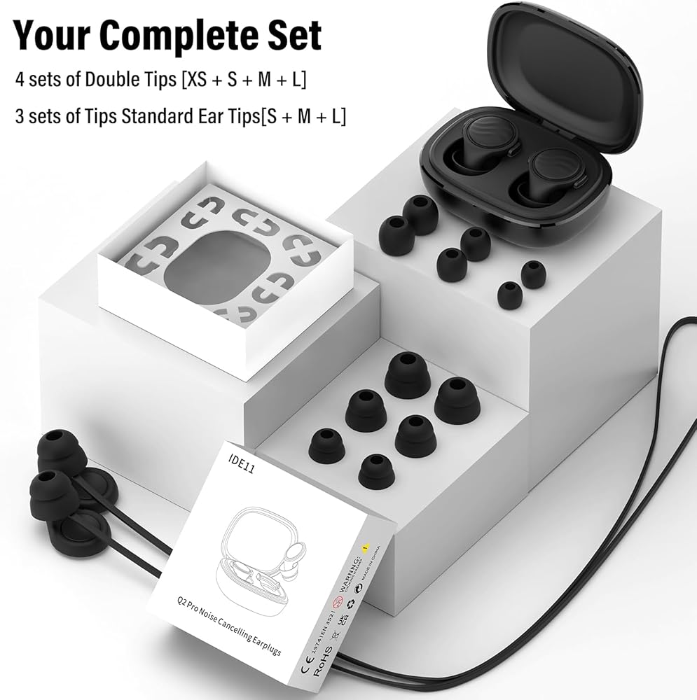 ماذا يوجد في العبوة: في صندوق Q2 Pro الصديق للبيئة، يوجد زوج من سدادات الأذن العازلة للصوت المخصصة للنوم، و6 أزواج من أطراف الأذن المصنوعة من السيليكون (بأحجام XS/S/M/L، مع أطراف أذن فردية ومزدوجة) وحقيبة حمل إضافية لتوفير الراحة أثناء التنقل. قابلة لإعادة الاستخدام وقابلة للغسل ومحمولة، مما يوفر حلاً مستدامًا لسدادات الأذن