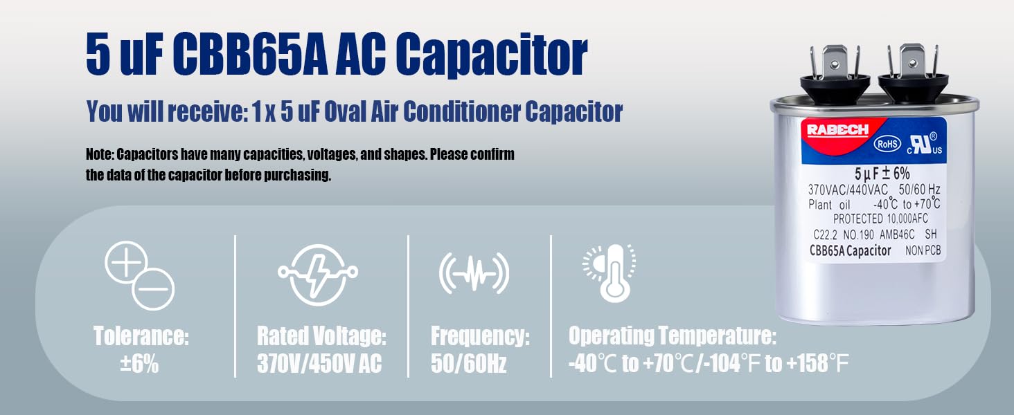 • RABECH 5 uF ± 6% 370V/450V CBB65A ac مكثف - مكثف تشغيل بيضاوي.