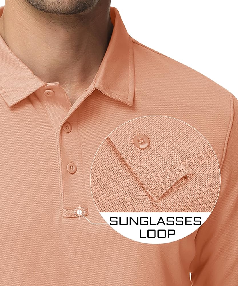 التصميم - قمصان بولو للرجال بأكمام قصيرة مع فتحة بثلاثة أزرار، وياقة كلاسيكية منتشرة ورقبة خالية من العلامات؛ يوفر الراحة القصوى أثناء ممارسة الرياضة في الهواء الطلق؛ تعمل درزات فلاتلوك والرقبة الخالية من العلامات على تقليل الاحتكاك وزيادة الراحة.