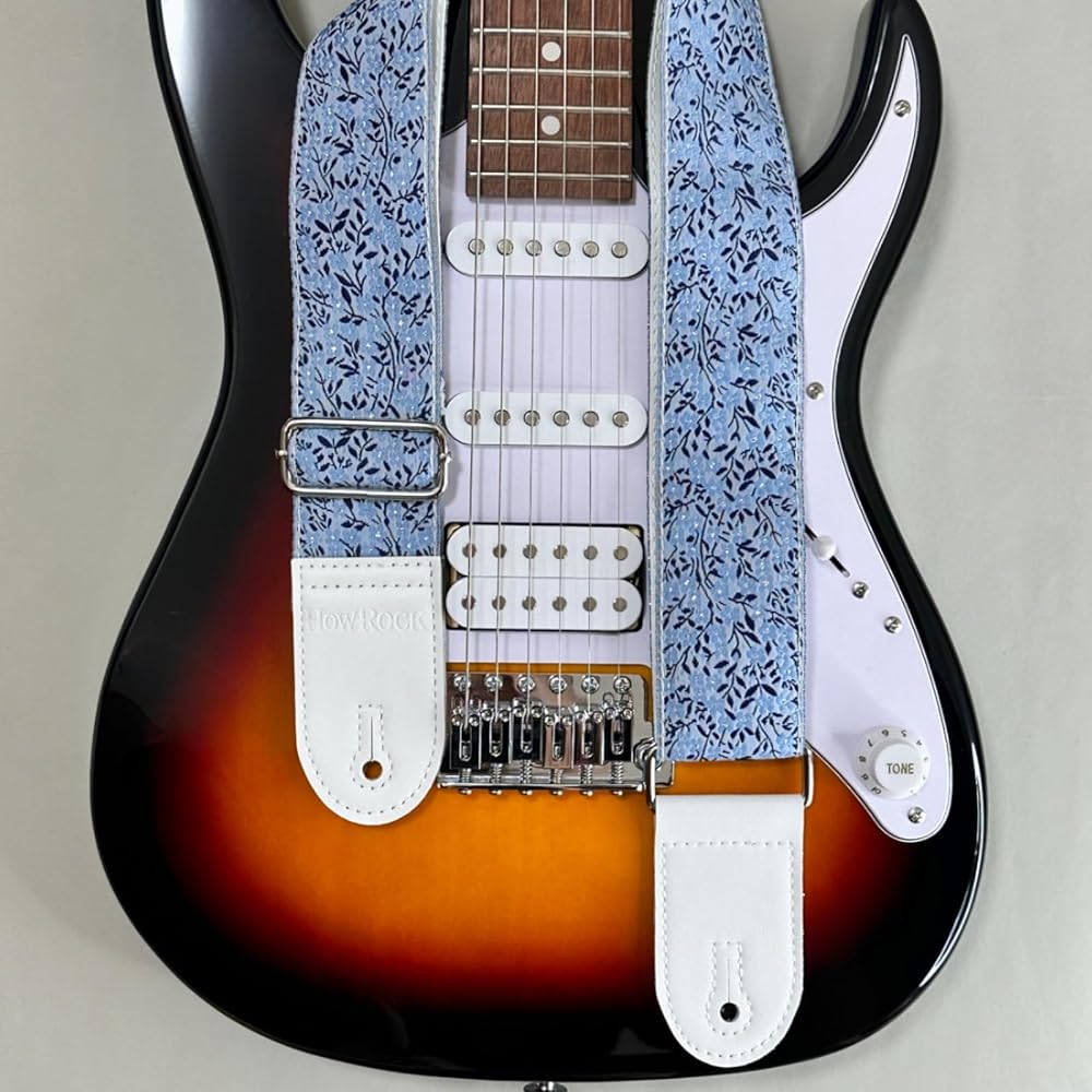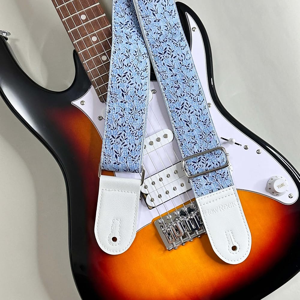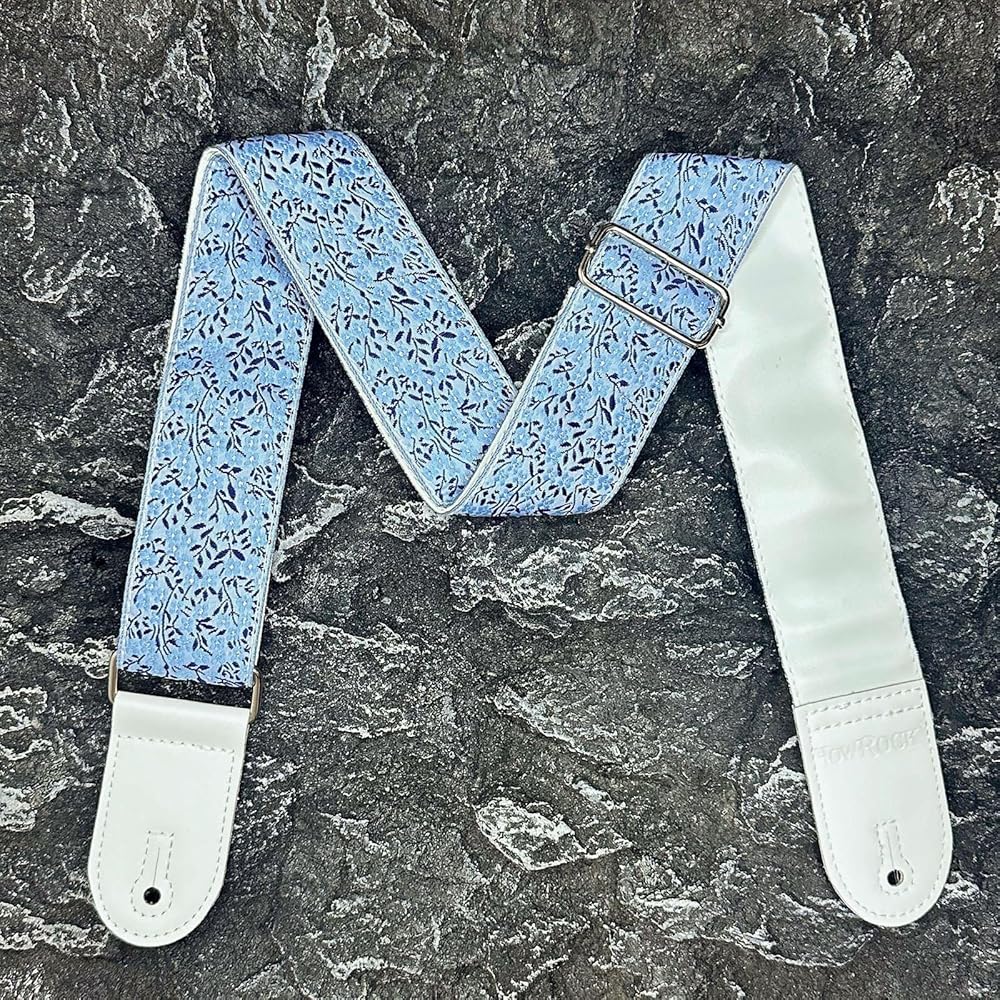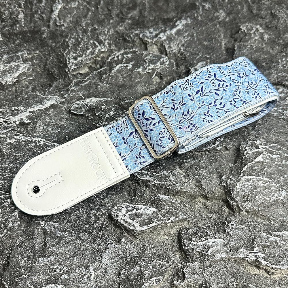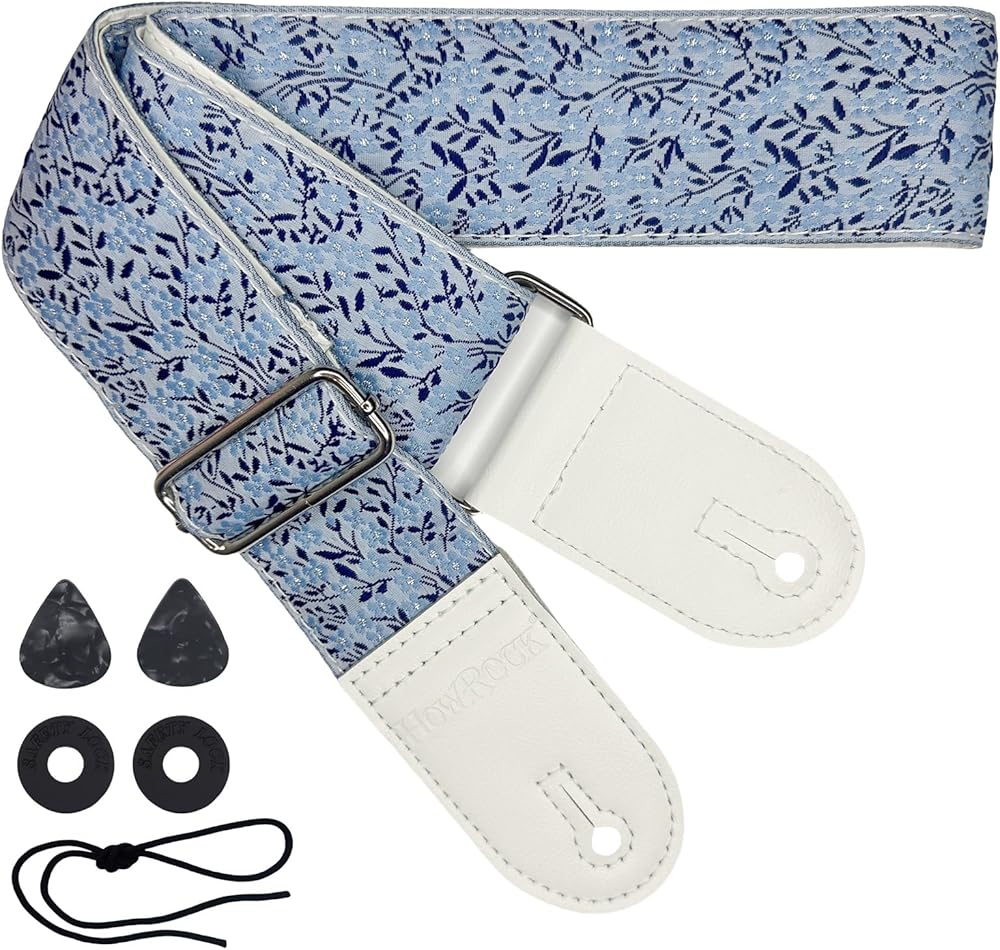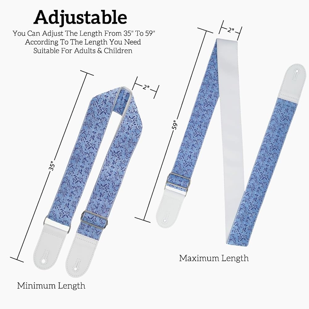 Premium Guitar Strap - Durable 3D cotton & leather construction with comfortable 2" wide, 2mm thick design. Adjustable (35" - 59") with secure carbon slider. Stylish blue floral jacquard embroidery. Fits all guitars (acoustic/ electric/ bass/ ukulele). Includes 1 guitar strap, 2 gaskets, 2 picks & 1 headstock rope