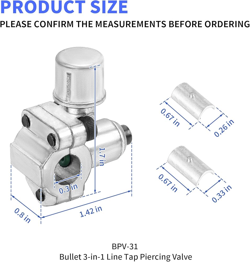 【High Compatibility】The BPV-31 Bullet Piercing Valve Line Tap Valve Kit is fully compatible with 1/4, 5/16, 3/8 inch outside diameter pipes. It replaces the following part numbers: AP4502525, BPV31D, GPV14, GPV31, GPV38, GPV56, MPV31, TJ90BPV31.