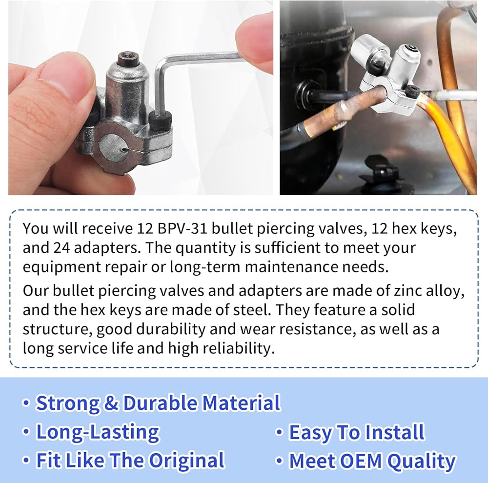 【Premium Quality】The BPV-31 Bullet Piercing Valve Kit is made of high-grade zinc alloy that resists corrosion, rust, and wear, even in environments with high humidity or exposure to refrigerants, extending its service life and providing reliable performance. The heavy-duty steel construction ensures it will not peel or bend during installation, providing a secure torque fit.