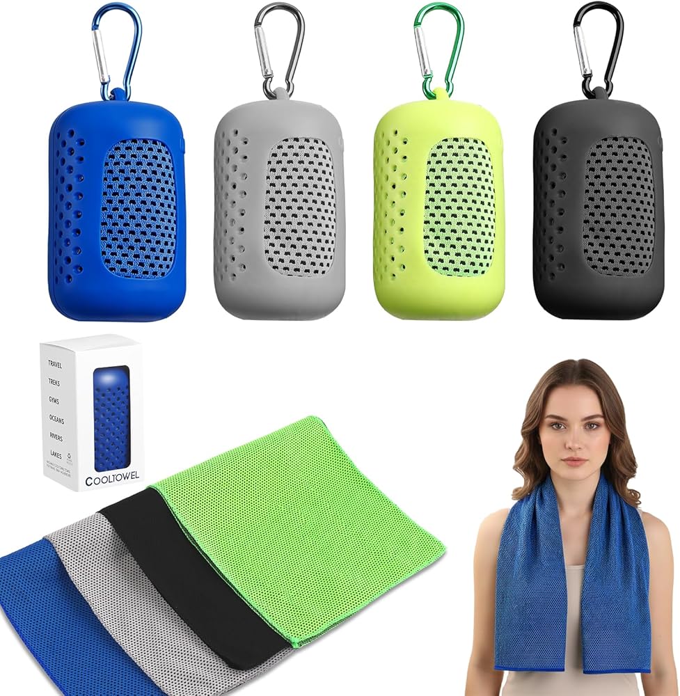 4 عبوات من مناشف التبريد مع حافظات حمل من السيليكون، منشفة ثلج من الألياف الدقيقة لليوجا والجري وصالة الألعاب الرياضية والتمرين والرياضة واللياقة البدنية - مجموعة مناشف باردة ناعمة قابلة للتنفس مع لفافات عنق تبريد وصندوق هدايا