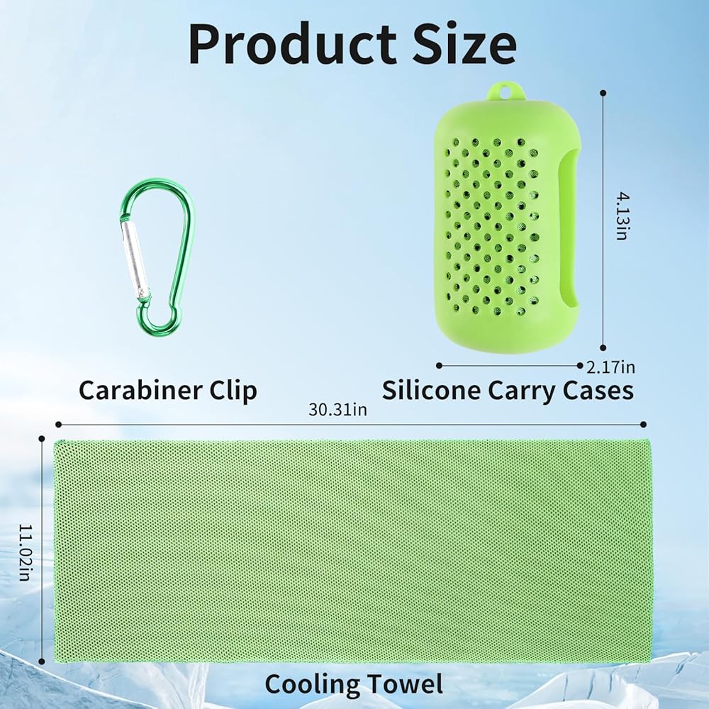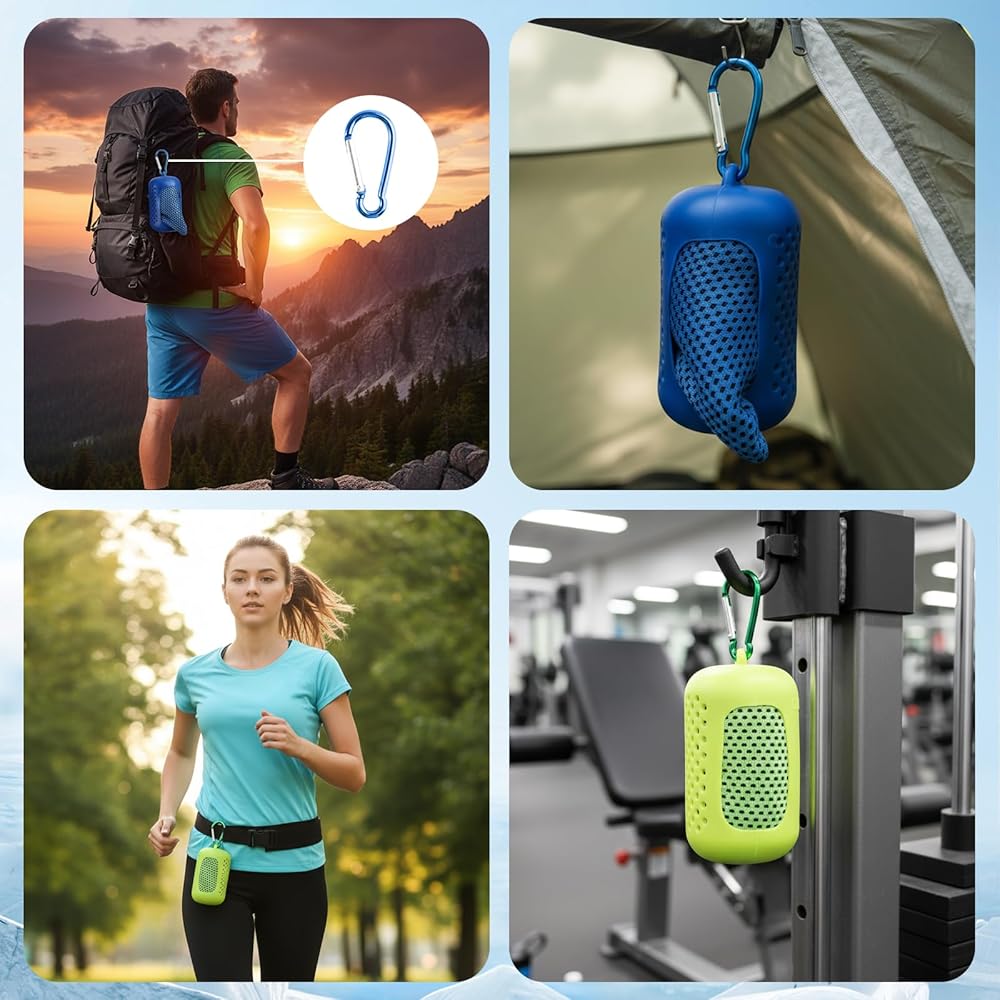 【Compact & Travel-Ready - Silicone Case】Each cooling towel comes with its own ventilated silicone case ( 2.17"x2.17"x3.94" inches) featuring a secure carabiner clip for easy attachment to gym bags, backpacks or golf gear. The breathable mesh design prevents moisture buildup while keeping your towels clean between workouts. At just 0.13lbs, this ultra-lightweight set is perfect for travel, camping essentials, or sports gear - fitting easily in any luggage or sports equipment bag without bulk.
