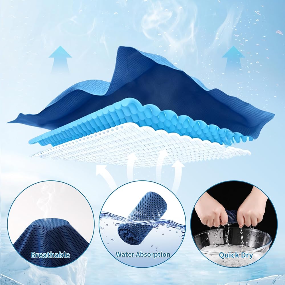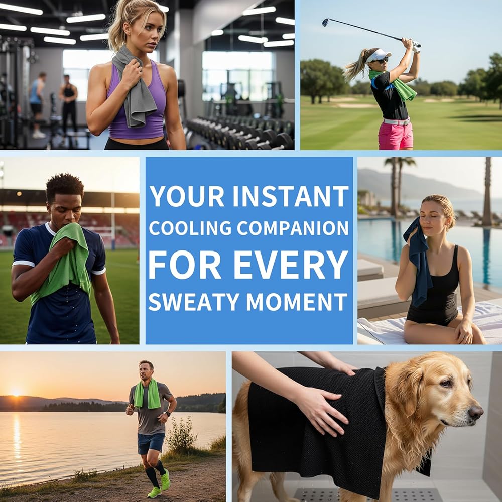 【Premium Multi-Use Cooling Towel】Designed for athletes, outdoor enthusiasts, and even pets, this premium multipurpose cooling towel is pefect for golf, swimming, football, gym, fitness activities, and wherever you need, offering heat and sun protection. Use it as a head cover, neck wrap, or scarf to relieve headaches, fever, or migraines during hot summers. The fast-drying fabric absorbs sweat for CrossFit, rock climbing, or golf trips while the silicone storage case ensures portability.