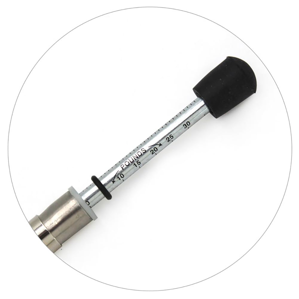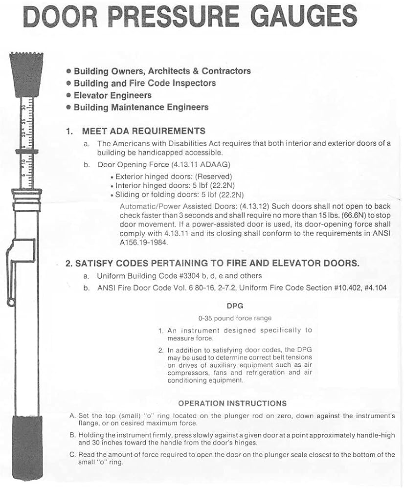 Range is from 0-35 Pounds Door Pressure Gauge instrument design specifically to measure force. OPERATING INSTRUCTIONS: Set the top (small) o-ring located on the plunger rod on zero, down against the instrument's flange; or set the o-ring on the desired force. Holding the instrument firmly, press slowly against the door at a point approximately handle-high, and 30 inches away from the door's hinges. Read the amount of force required to open the door on the plunger scale closest to the bottom of the small o-ring. MEET ADA REQUIREMENTS The Americans with Disabilities Act requires that both interior and exterior doors of a building be handicapped accessible. Door Opening Force (4.1311 ADAAG). Exterior hinged doors: (Reserved) Interior hinged doors: 5 lbs (22.2N) Sliding or folding doors: 5 lbs (22.2N) Automatic/Power Assisted Doors: (4.13.12) Such doors shall not open to back check faster than 3 seconds and shall require no more than 15 lbs (66.6N) to stop door movement. If a power assisted door is used, its door-opening force shall comply with 4.13.11 and its closing shall conform to the requirements in ANSI A156.19-1984.