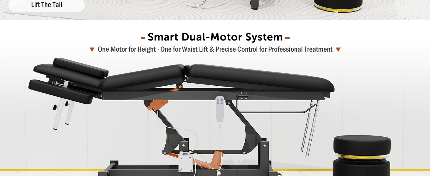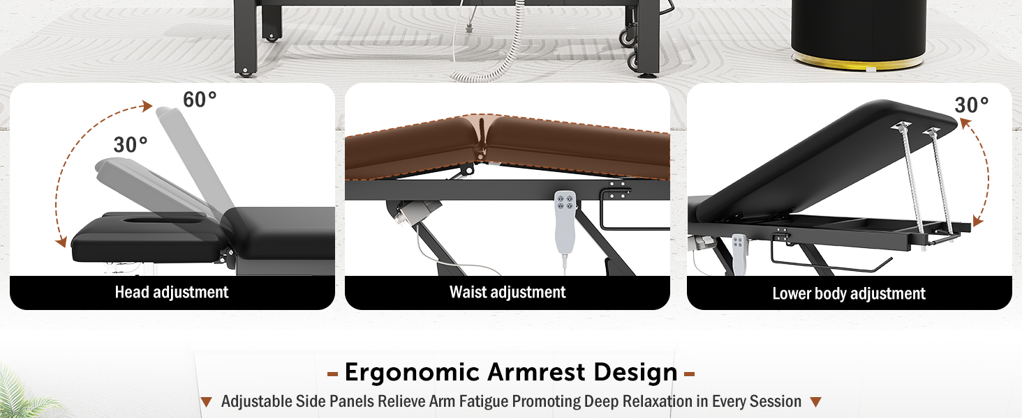 • تصميم قابل للتعديل من 3 أقسام مع دعم رفع الخصر، يتميز بتصميم سطح الطاولة من ثلاثة أقسام - الرأس والجزء العلوي من الجسم والجزء السفلي من الجسم - مع تعديل زاوية مستقل. المحرك المدمج الموجود أسفل القسم الأوسط يرفع بلطف لدعم البطن، مما يخفف الضغط على أسفل الظهر ويعزز الراحة. يساعد هذا التصميم أيضًا المعالجين على التحكم بشكل أفضل في كثافة التدليك ودقته أثناء العلاج.