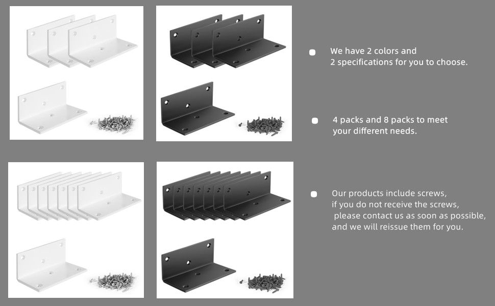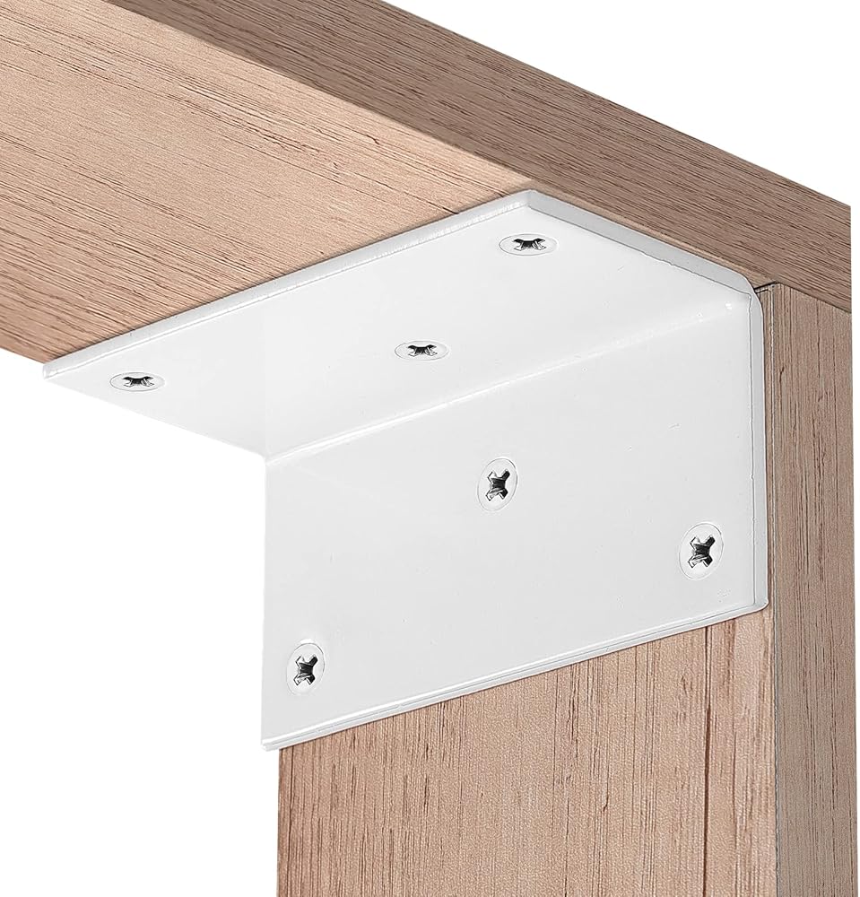 قائمة التعبئة: 4 بوصة × 2 بوصة × 2 بوصة دعامة معدنية بيضاء، دعامة زاوية خشبية 90 درجة 8 قطع، 1 حزمة برغي.