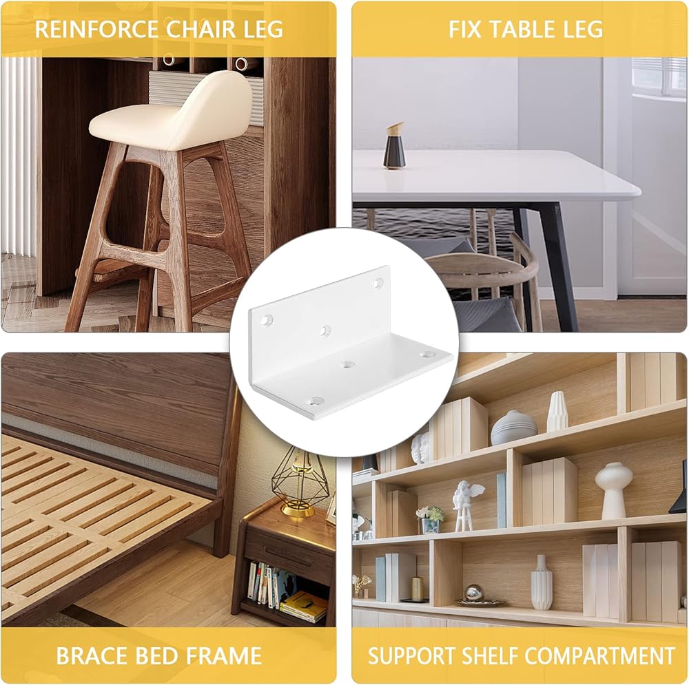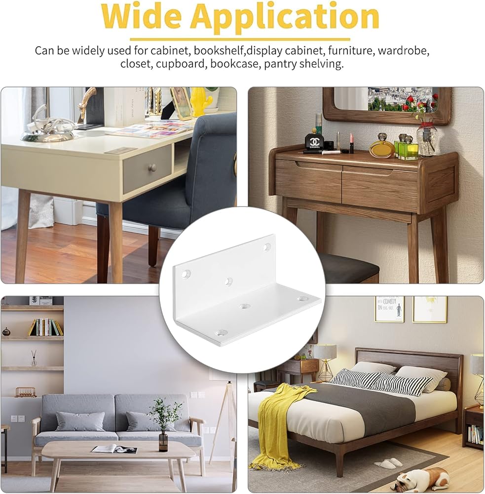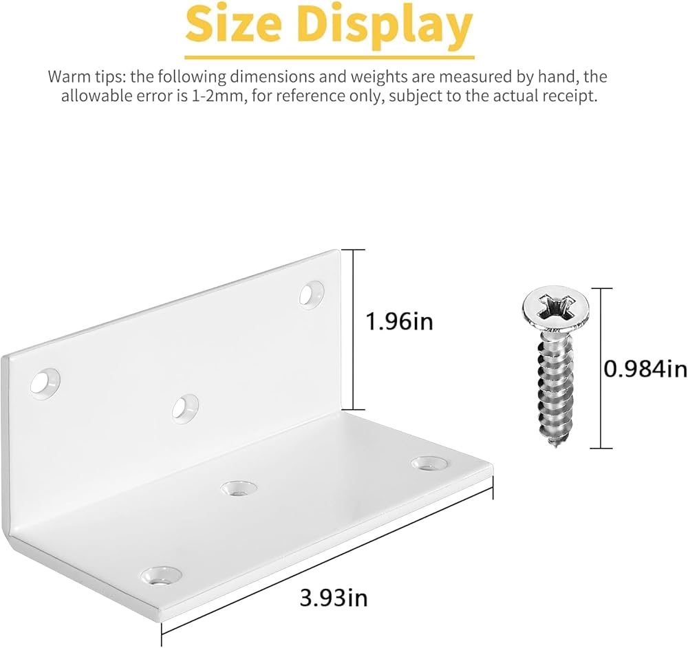 دعامة معدنية 90 درجة: هذه الدعامات شديدة التحمل على شكل حرف L مصنوعة من حديد عالي الجودة، قوي ومتين. دعامات الفتحات الستة أكثر استقرارًا وغير متذبذبة، ودعامات الزوايا مطلية باللون الأبيض غير اللامع، وهو ليس ناعمًا وجميلًا فحسب، ولكنه أيضًا متين للغاية ويمكن استخدامه لفترة طويلة.