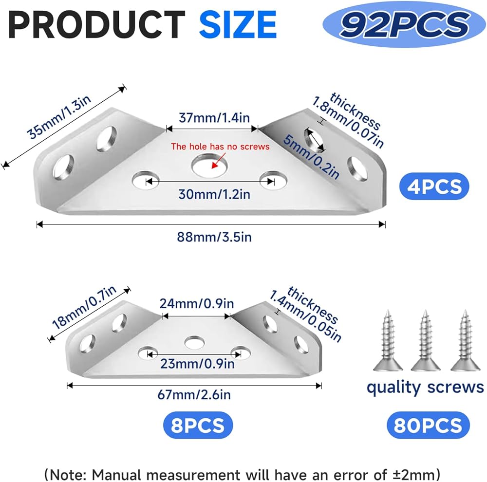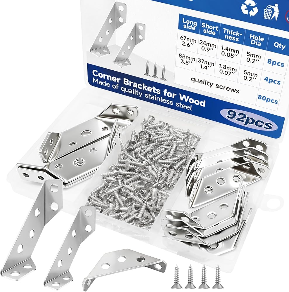 12 مجموعة/92 قطعة مقاسين L دعامات زاوية للأجهزة الخشبية دعامة زاوية شديدة التحمل عالمية من الفولاذ المقاوم للصدأ مع مسامير لطاولات الأثاث والكراسي ودرج الخزانة YY031