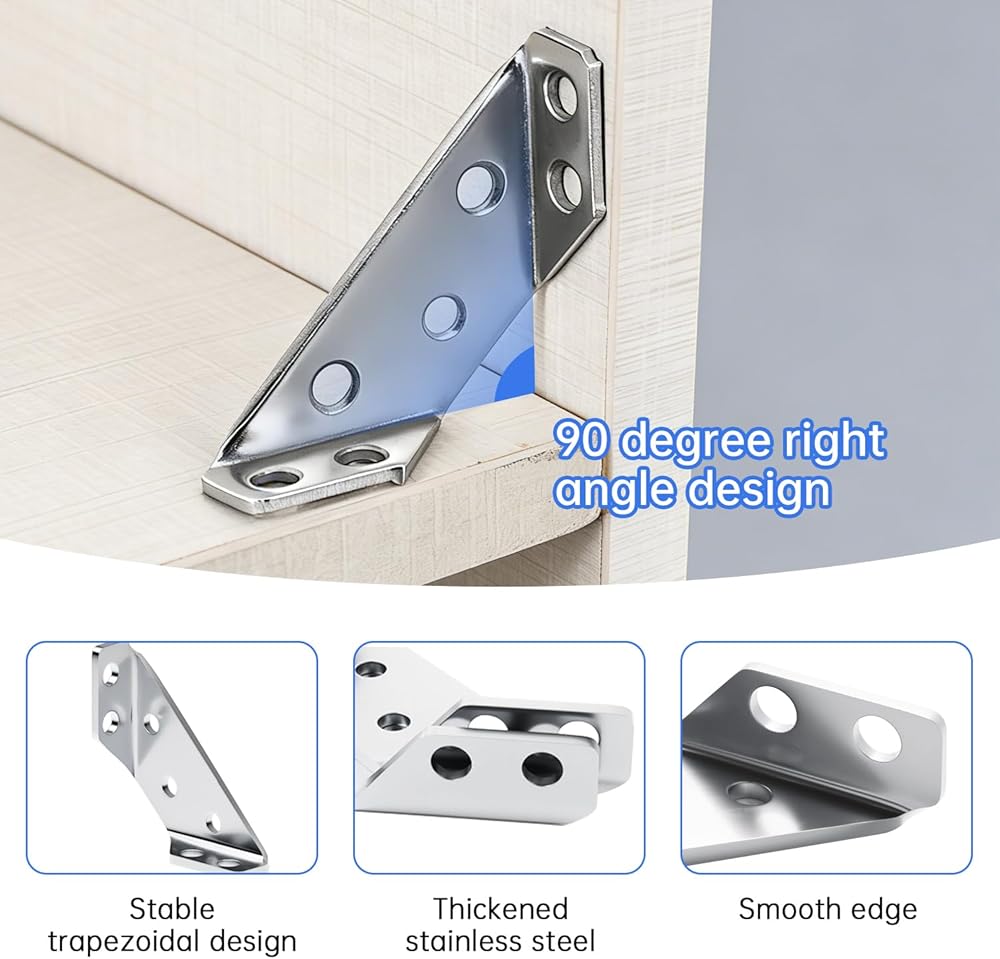 Stable triangular design: The angle brackets can connect three panels at the same time to form a stable triangular structure, which is installed vertically at 90 degrees, and multiple screw holes make it firmly fixed on the panels