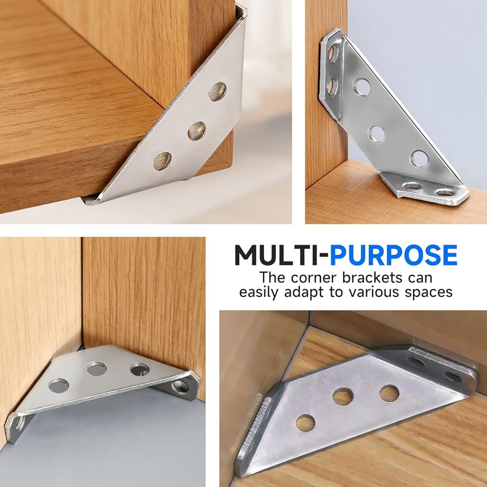 Reliable material: Our corner bracket is made of heavy-duty stainless steel with one-piece molding, our corner braces for wood has 7 holes, 90-degree angle and smooth surface. Rust-proof, waterproof and sturdier than traditional ones, ideal for indoor furniture and outdoor wooden product fixing