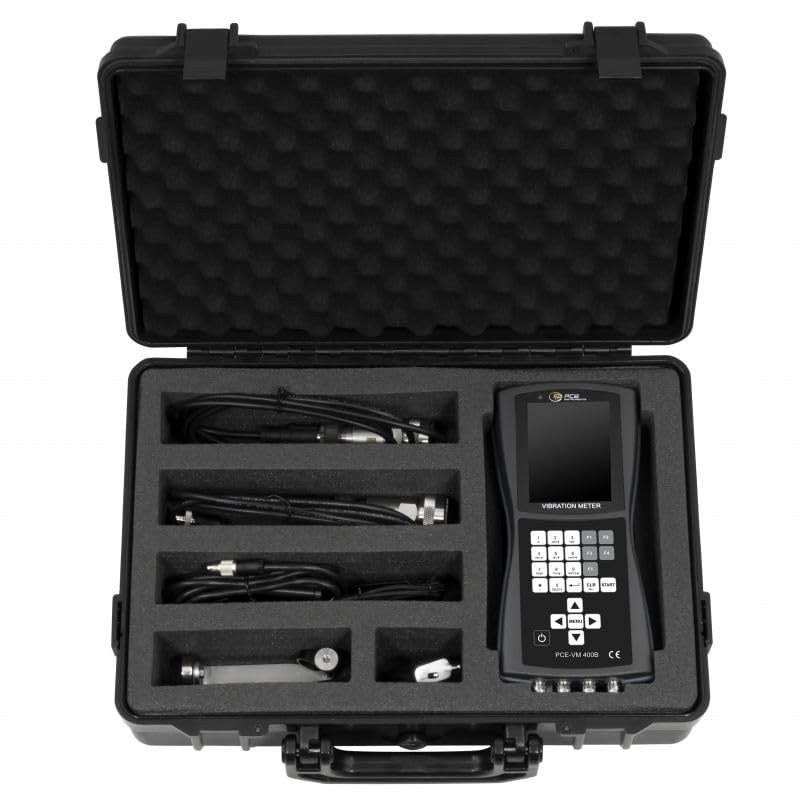 This advanced 4-channel vibration analyzer is a precision instrument designed for comprehensive machinery monitoring and analysis. It simultaneously measures acceleration (up to 656 ft/s²), velocity (up to 7.87 in/s), displacement, and rotational speed (up to 200,000 rpm) across four independent channels. The analyzer features high-quality piezoelectric sensors with 55-inch cables for accurate vibration detection on shafts and bearings. With its balancing capability supporting up to 8 correction planes and evaluation according to ISO 10816 standards, this tool is essential for maintaining rotating equipment. The device includes a 3.5-inch VGA color display and stores data on its 4GB internal memory, accessible via USB interface. Powered by a 3200 mAh lithium-ion battery providing 8 hours of operation, this compact unit (8.6 x 3.9 x 1.6 inches) weighs just 1 pound. The analyzer operates in temperatures from 14 to 122°F and includes multiple language support, making it an invaluable tool for engineers and technicians in industrial maintenance applications.