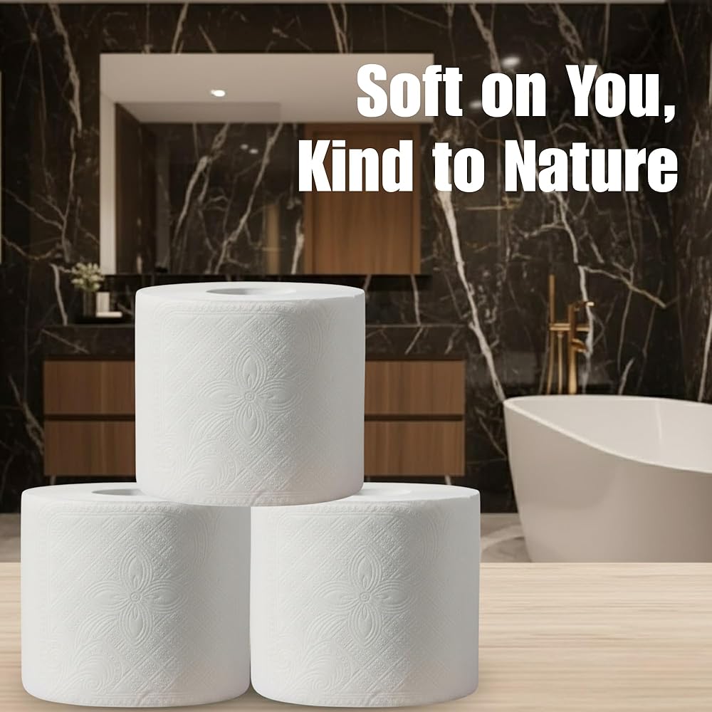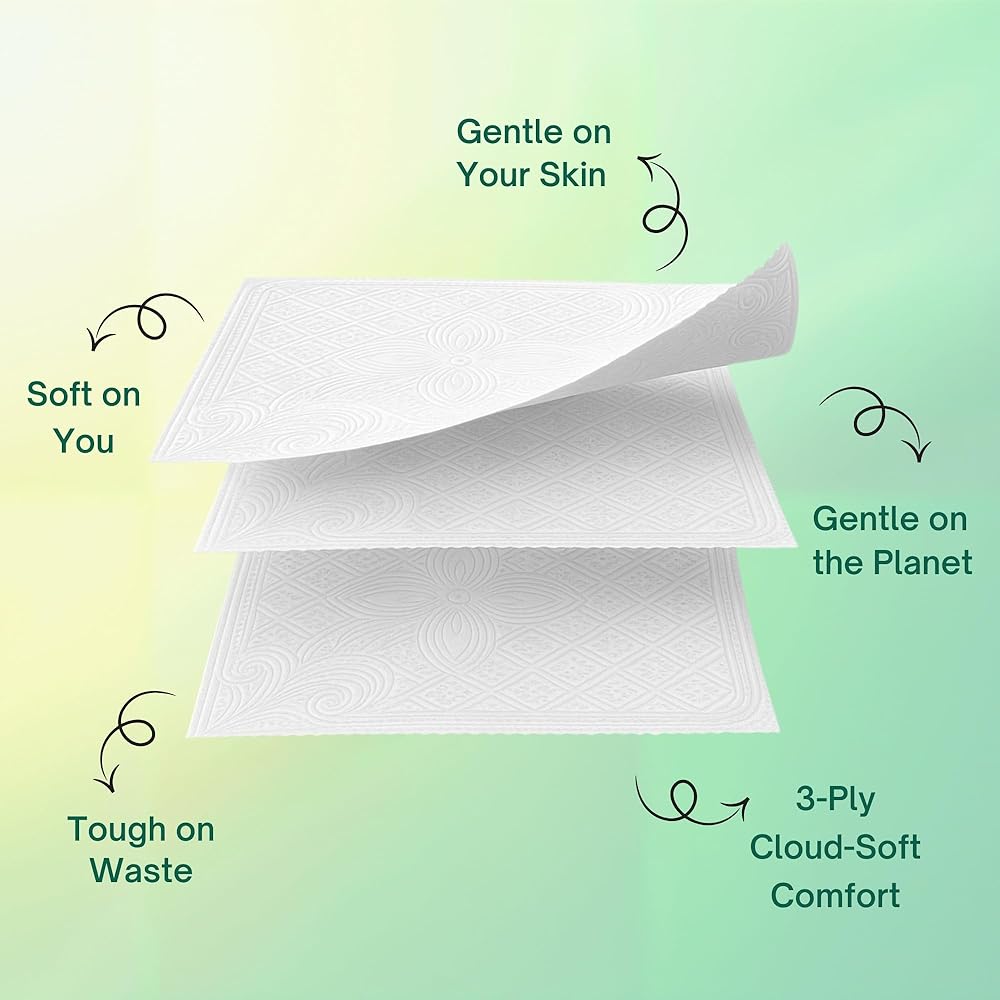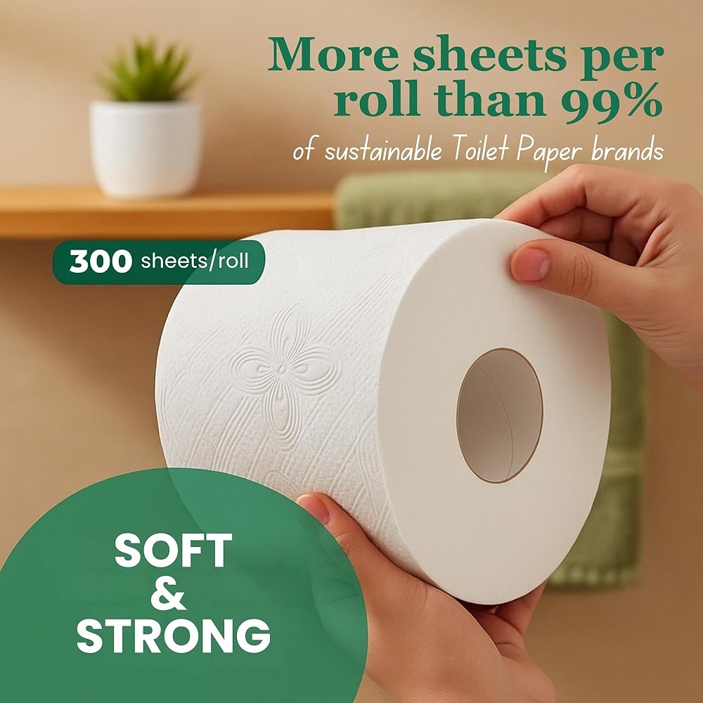 - عبوة قيمة عائلية - كل لفة تحتوي على 300 ورقة. متوفرة في عبوات مكونة من 24 لفة، مثالية للمنازل أو المكاتب أو المشترين المهتمين بالبيئة.