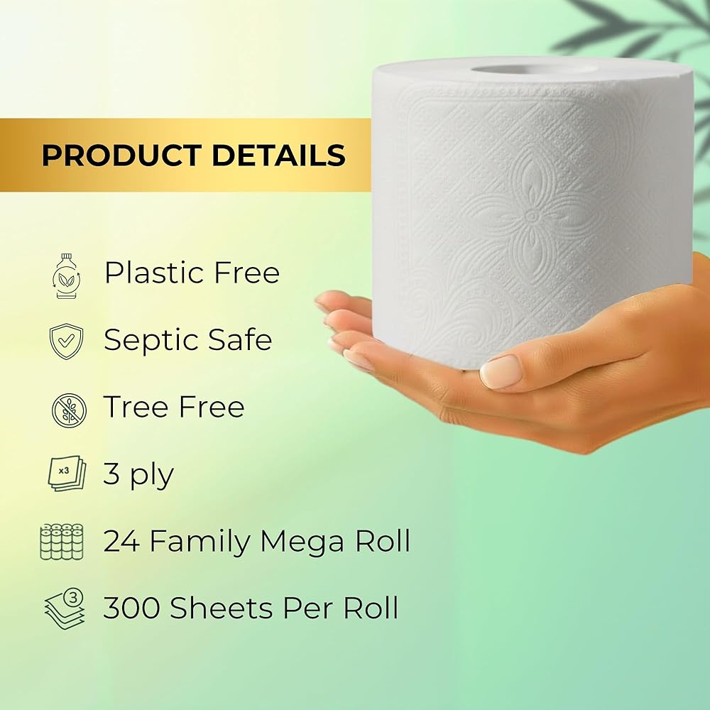 ورق تواليت فاخر 100% من الخيزران الخالي من الأشجار - 24 لفة ضخمة ممتازة، فائقة النعومة وقوية 3 طبقات 300 ورقة في كل لفة، صديقة للبيئة، خالية من البلاستيك، مناديل آمنة للصرف الصحي، نحن ننقذ الأشجار.