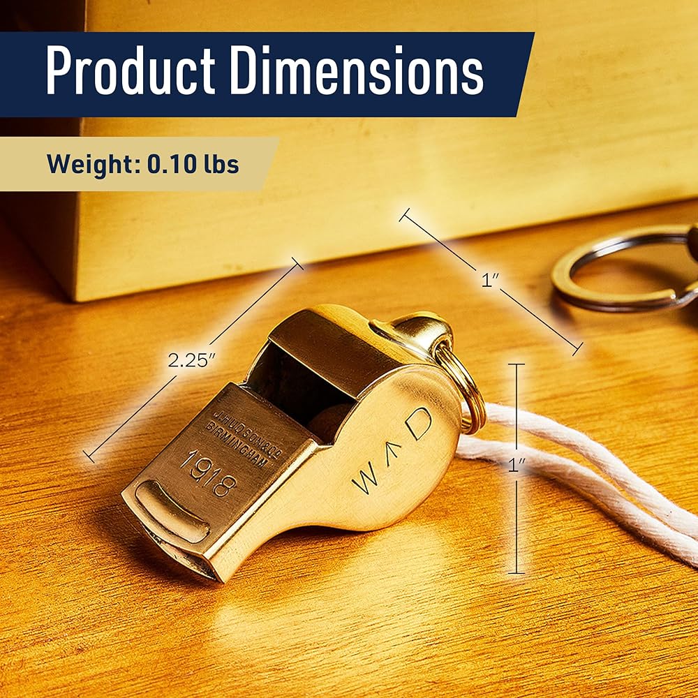 تفاصيل المنتج - المواد: النحاس. الأبعاد: (طول) 2.25 بوصة × (عرض) 1 بوصة × (ارتفاع) 1 بوصة. وزن المنتج: 0.1 رطل. يشتمل على: صافرة عالية وحلقة سلسلة مفاتيح وشهادة الأصالة. مصنوع يدويًا في المملكة المتحدة. اللون: ذهبي.