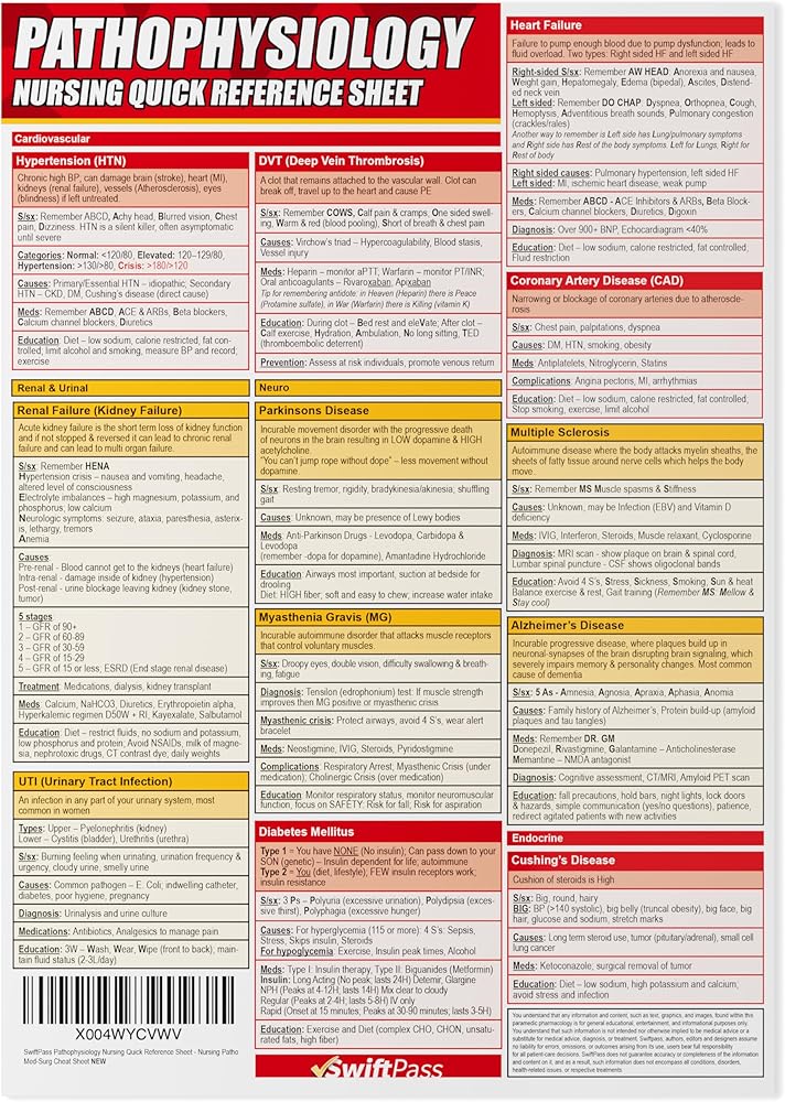 Master complex medical concepts with this comprehensive Pathophysiology Quick Reference Sheet designed specifically for nursing students and healthcare professionals. This invaluable study aid presents essential patho and med-surg information in a clear, organized format that's perfect for quick review during clinicals, exam preparation, or daily practice. The chart features key disease processes, symptoms, and nursing interventions, allowing you to quickly access critical information when you need it most. Ideal for visual learners, this reference tool helps simplify challenging concepts and serves as an excellent supplement to your textbooks and class notes. Whether you're a nursing student tackling difficult coursework or a practicing nurse wanting a reliable reference, this quick sheet helps you maintain crucial information at your fingertips. Display it in your study area or clinical workspace for easy reference during those crucial moments when rapid recall matters.