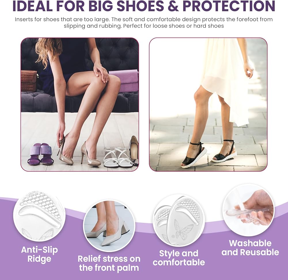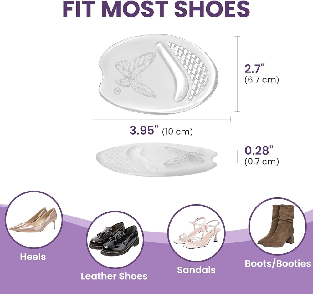 سطح غير قابل للانزلاق لارتداء آمن - يمنع السطح المزخرف لهذه الوسائد ذات مقدمة القدم الانزلاق سواء تم ارتداؤها حافي القدمين أو مع الجوارب. يضيف نمط الفراشة المزخرف لمسة أنيقة مع الحفاظ على الأداء الوظيفي في جميع أنواع الأحذية.