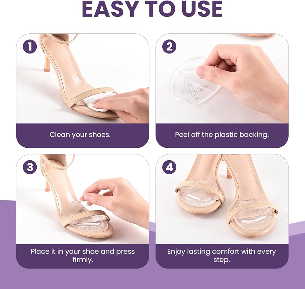 استخدام سريع وسهل - فقط قم بتنظيف نعل حذائك، وقشر الجزء الخلفي، واضغط على هذه الوسادات بقوة في مكانها. إنها توفر راحة فورية دون أي فترة انقطاع، مما يجعل حذائك أكثر راحة على الفور.