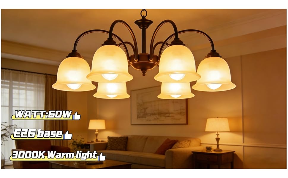 6 مجموعات من لمبات A19، قاعدة E26 مناسبة لتزيين وإضاءة معظم مصابيح المكتب والثريات ومصابيح الحائط ومصابيح الأرضية. عادة ما يكون اللون الأبيض الناعم 3000 كلفن هو العنصر الأساسي في تهيئة جو مريح ومريح للغرفة، وهو توازن مثالي بين الدفء والبرودة، مما يخفف من تعب العمل طوال اليوم، وهو مثالي للمنزل والمكتب والمطعم.