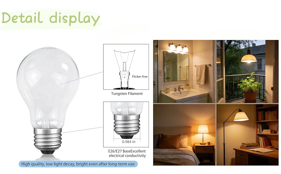 【توافق خافت للضوء وخالي من الوميض】تتمتع مصابيح الإضاءة المتوهجة الخافتة A19 بنطاق تعتيم سلس من 10-100%، والتي تم اختبارها لتكون متوافقة مع 95% من أدوات التعتيم الموجودة في السوق. لا طنين ولا طنين ولا وميض.