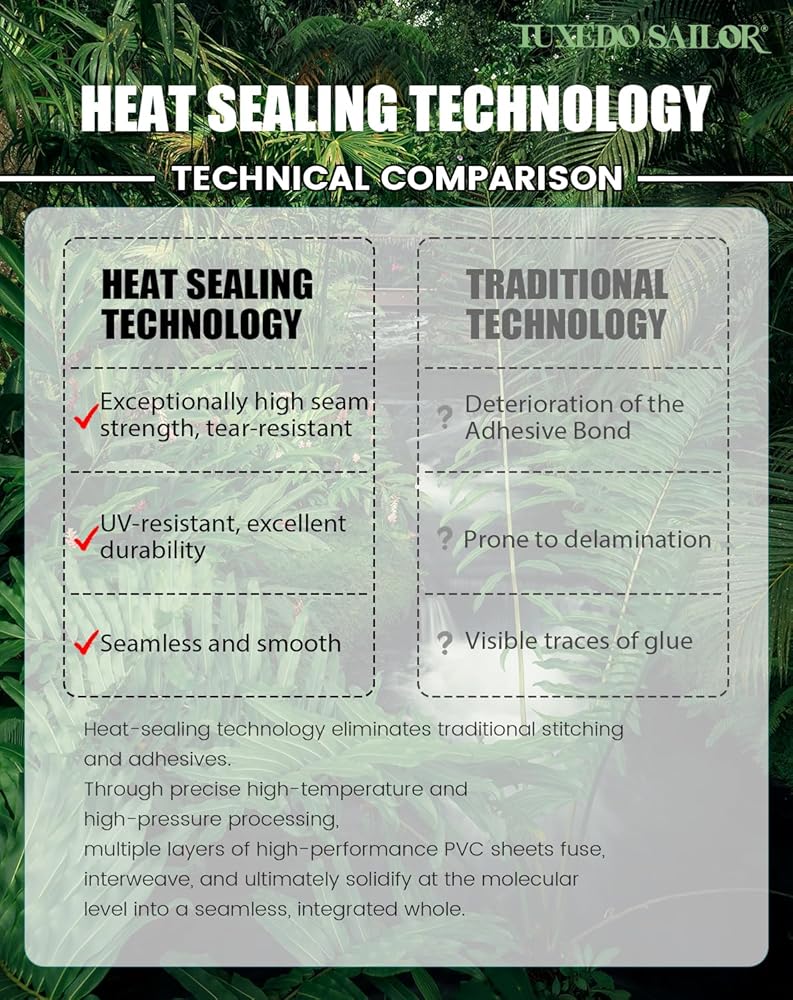 【تقنية بدون صمغ】 التصفيح الحراري هو تقنية تصنيع تربط طبقات متعددة من مادة PVC معًا عن طريق التسخين والضغط. إنها توفر مقاومة للتمزق، والمتانة، وخصائص إغلاق قوية، وطبقات جميلة من الناحية الجمالية.