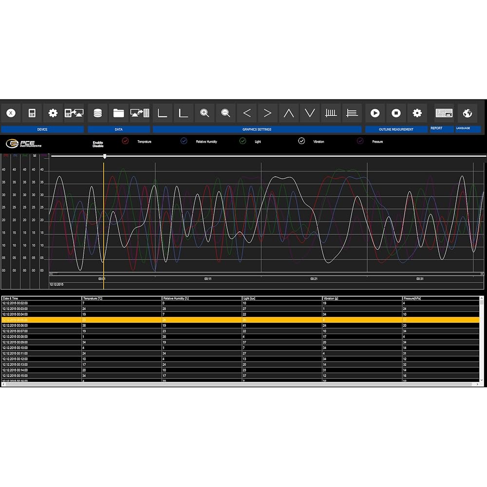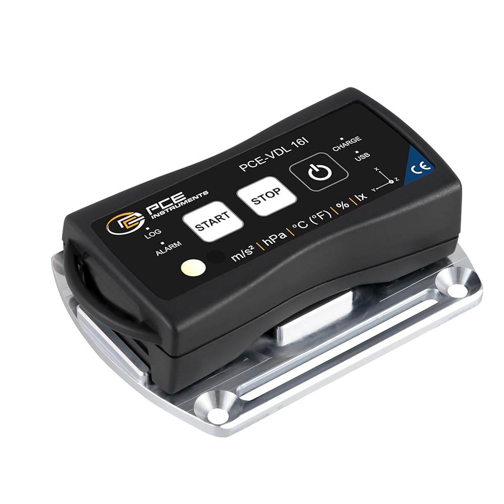 مقياس تسارع PCE-VDL 16I من أدوات PCE، للاهتزاز والمراقبة البيئية، يقيس ما يصل إلى 800 هرتز، إلى جانب درجة الحرارة والرطوبة وضغط الهواء والكشف عن الضوء