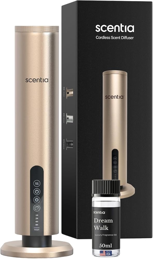 موزع رائحة الفندق اللاسلكي بدون ماء من سينتيا | يشتمل على مزيج زيت ممتاز مصنوع في الولايات المتحدة الأمريكية | التحكم بالتطبيق، لاسلكي | المنزل، المكتب، المنتجع الصحي، العلاج بالروائح | يغطي 1500 قدم مربع | 72 ساعة في شحن واحد | ذهب