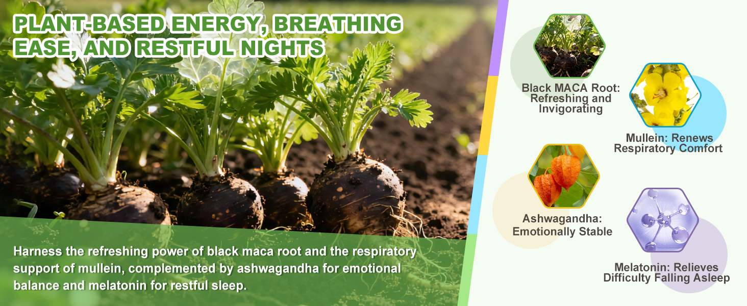 مكونات طبيعية قوية: مصنوعة من مستخلصات قوية مثل مولين، والميلاتونين، والأشواغاندا، وجذور الماكا، وإل-ثيانين للحصول على دعم فعال.