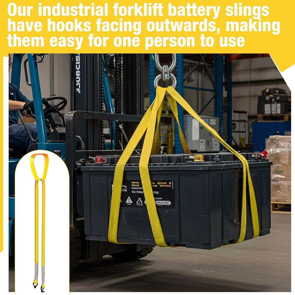 Equipped with vinyl-coated hooks that protect battery casings from scratches and designed to face outward, this lift sling allows for smooth, single-person operation. Crafted with industrial applications in mind, it's perfect for forklift battery swaps, warehouse maintenance, and factory installations.