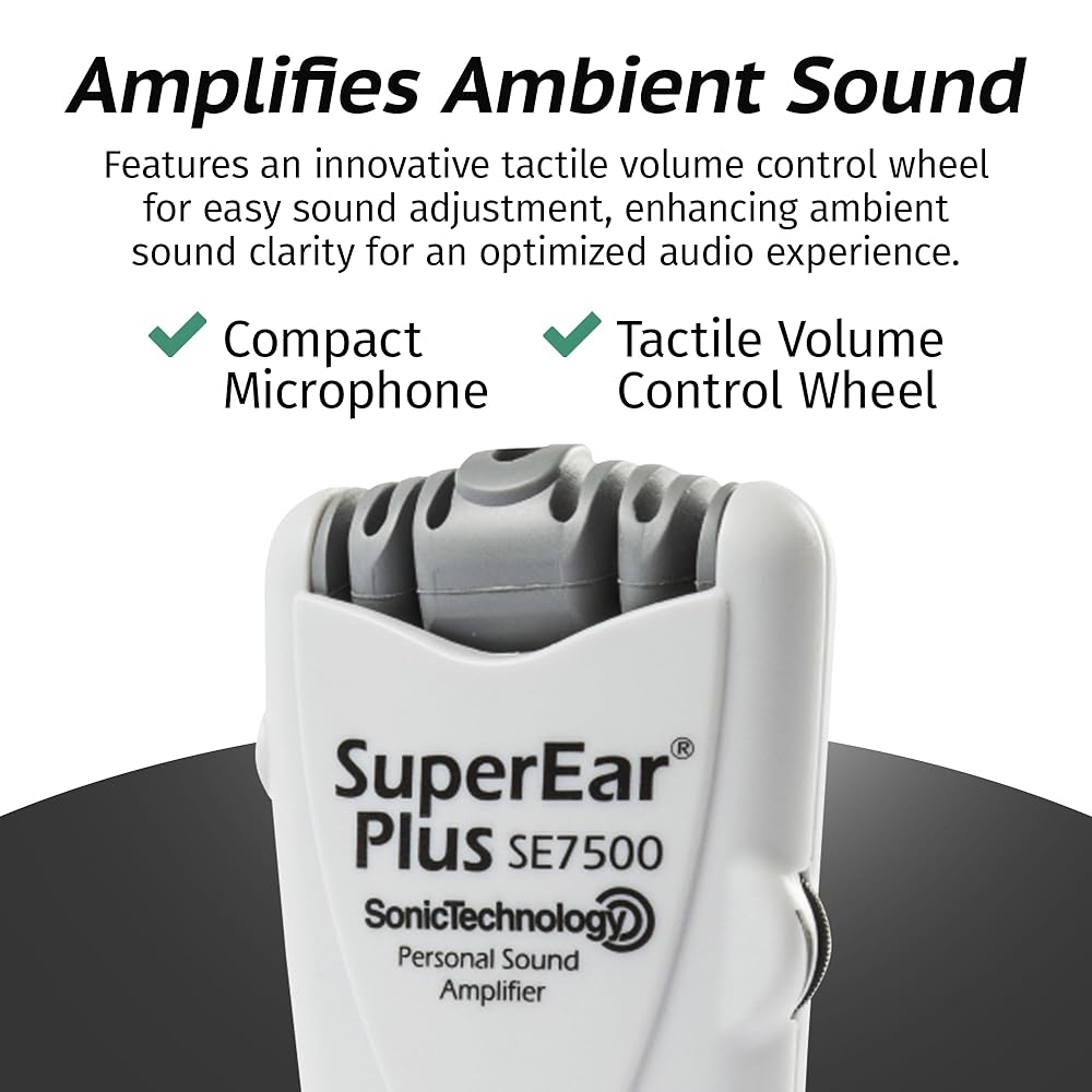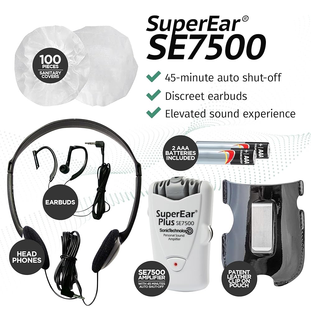 • Complete Sound Amplifier System: This comprehensive kit includes the SuperEar Plus SE7500 personal amplifier, 2 AAA batteries, lightweight headphones and earbuds, a carry case/belt clip for portability, and an owner's manual for easy setup.