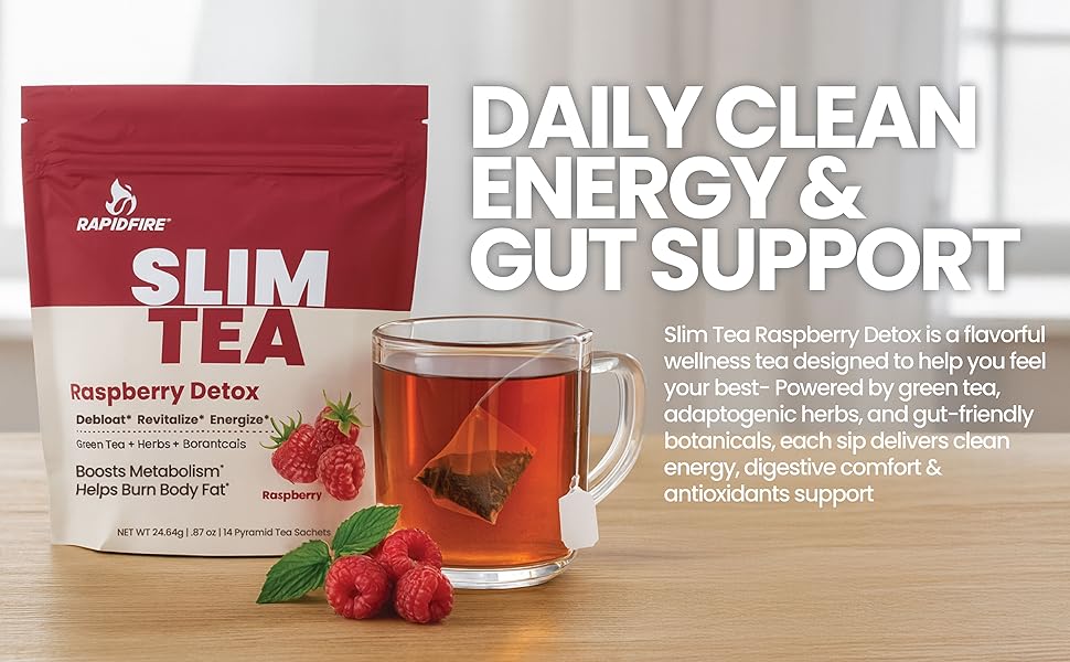 CLEAN ENERGY & DAILY WELLNESS SUPPORT. Infused with adaptogenic herbs and green tea extract, Rapid Fire Slim Tea delivers a gentle, natural energy boost to help you power through your day without jitters or crashes.