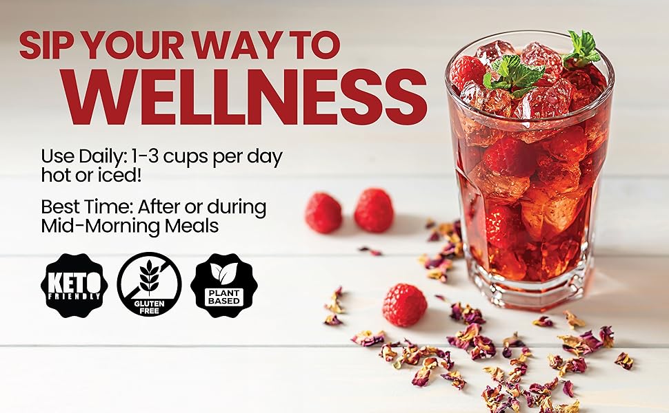 PLANT-BASED, GLUTEN-FREE & KETO-FRIENDLY. Made with organic, non-GMO ingredients and free from artificial additives, this tea fits seamlessly into vegan, gluten-free, and keto-conscious lifestyles.