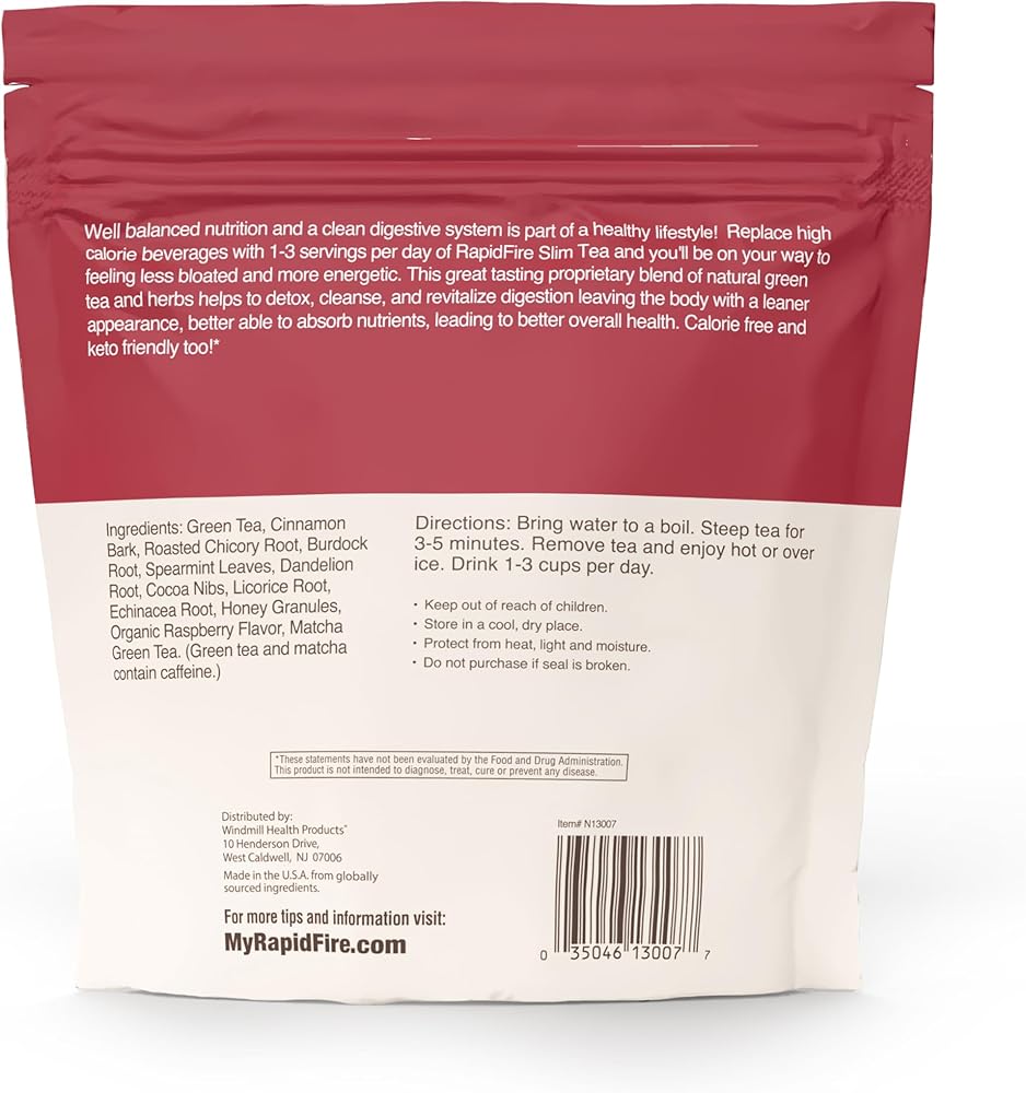 Rapid Fire Slim Tea Raspberry is a flavorful, wellness-focused tea blend designed to support your daily routine with clean, natural energy. Infused with green tea extract and adaptogenic herbs, it offers a smooth boost to help you stay energized and focused—without the jitters or crashes. This thoughtfully crafted formula includes organic rooibos, rose hips, and ginger root to support healthy digestion and gut comfort, making it a perfect addition after meals. Rich in polyphenols and antioxidants from premium ingredients like matcha and organic green tea, it helps protect your body from everyday oxidative tear. With its refreshing tropical mango flavor, this tea is a delicious, satisfying alternative to sugary drinks. Made with organic, non-GMO ingredients, Rapid Fire Slim Tea is plant-based, gluten-free, and keto-friendly—perfect for a clean, balanced lifestyle.