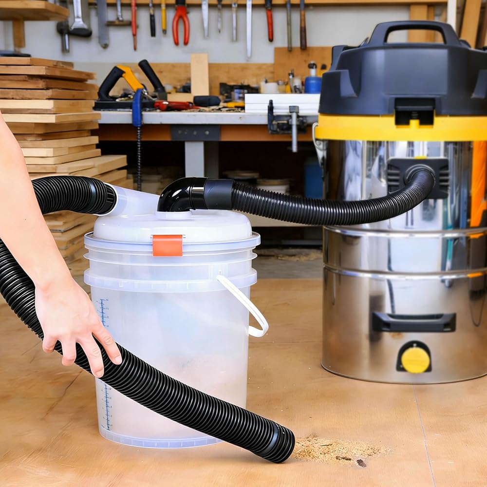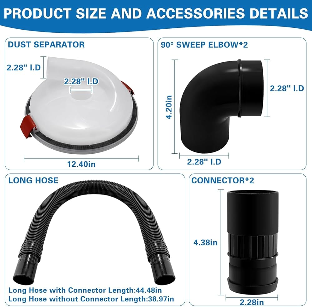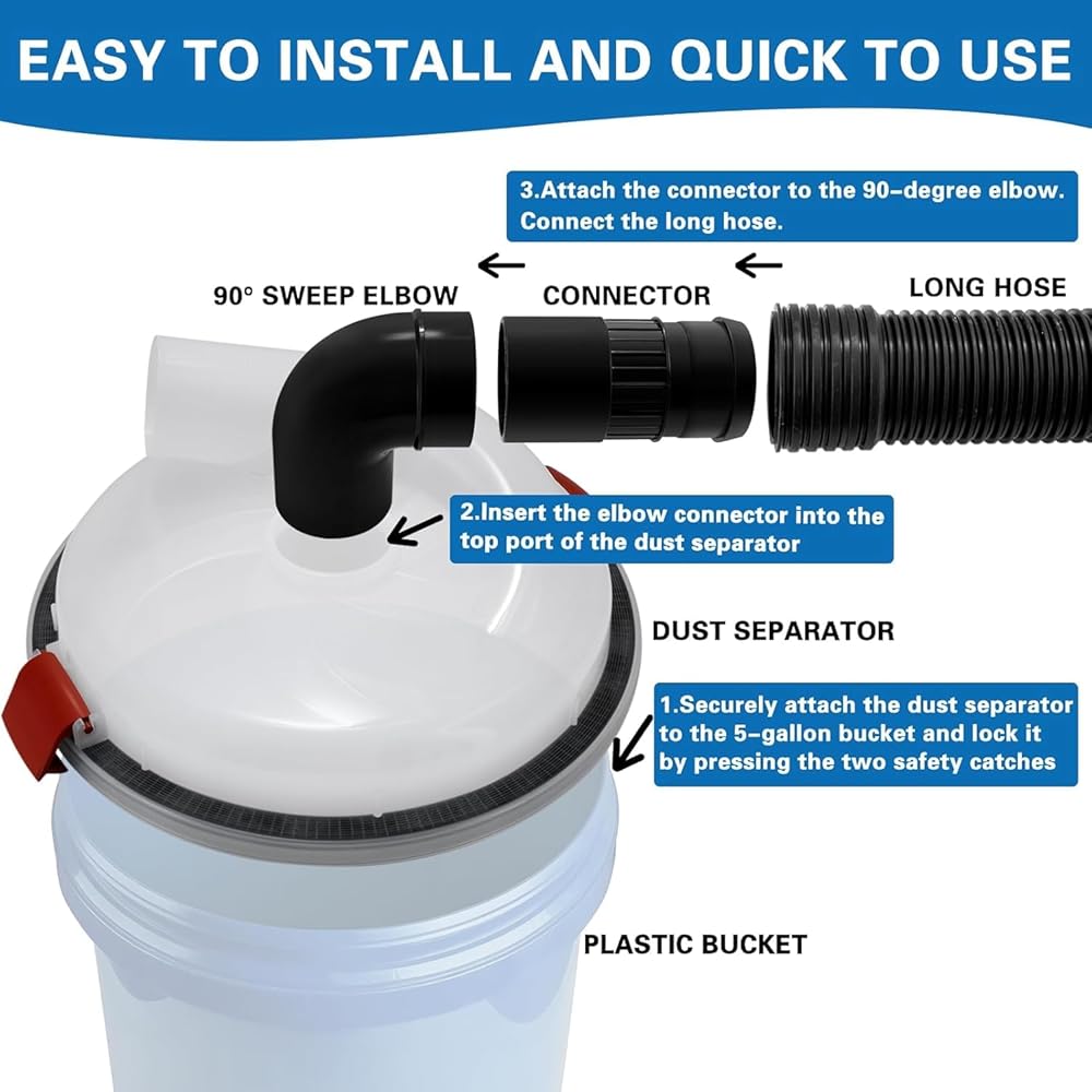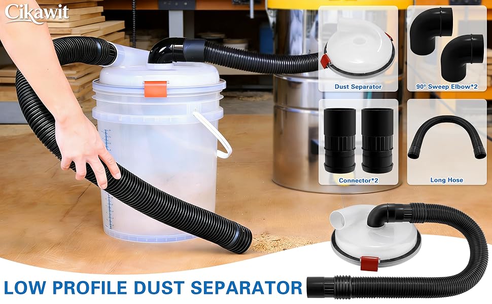 فاصل الغبار المتقدم: يساعد على توجيه رقائق الخشب والغبار والجزيئات الأكبر حجمًا إلى الدلو قبل أن تصل إلى مكنستك الكهربائية، مما يحافظ على نظافة مساحة العمل الخاصة بك ويقلل من تراكمها داخل المكنسة الكهربائية.