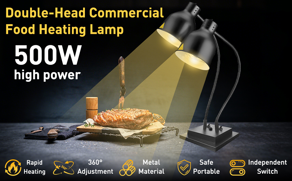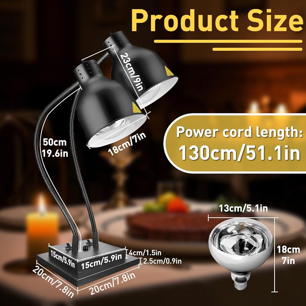 قابل للدوران 360 درجة: كلا أغطية المصابيح الخاصة بمصباح تسخين الطعام هذا مصنوعة من خرطوم معدني قابل للدوران. التحكم بدقة في التدفئة واتجاه الضوء. ارتفاع قابل للتعديل يناسب الطعام بجميع أحجامه.