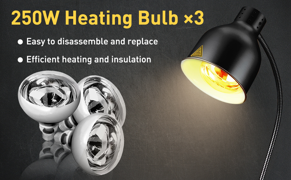 مصباح التدفئة الكهربائية: كل لمبة لديها معدل طاقة 250 واط. تعمل اللمبة عالية الطاقة على تسخين الطعام تحته بسرعة.